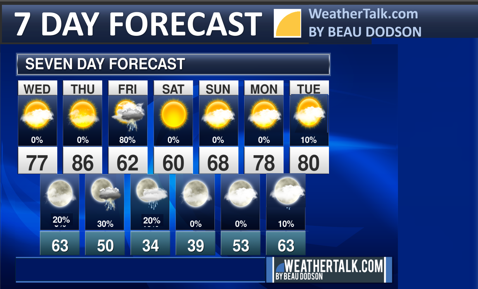 2. Are organized severe thunderstorms. UNLIKELY. At this time, the risk appears minimal. I am watching Thursday night and Friday. A cold front will push across the area with showers and some thunderstorms. It appears the severe weather will stay to our north.