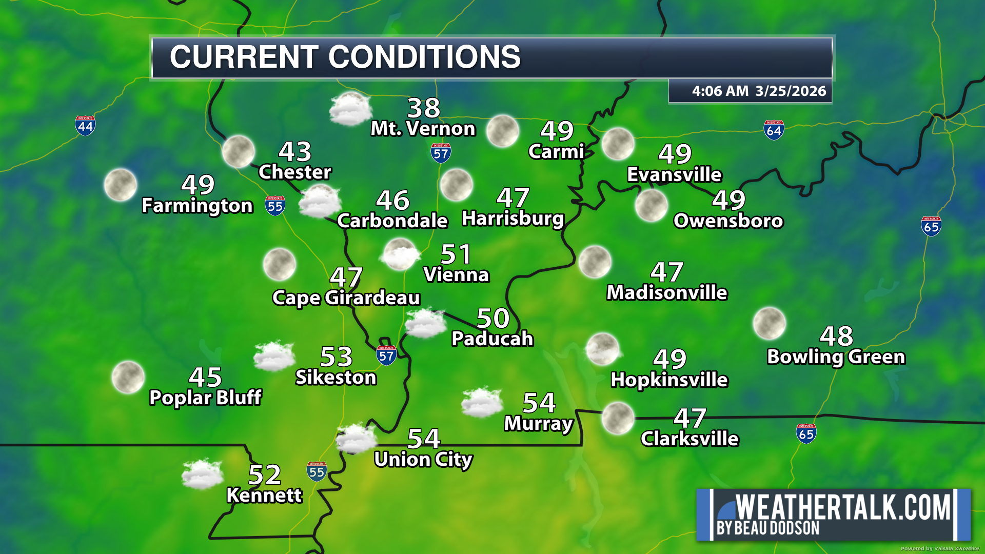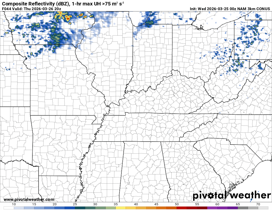 - A few showers and thunderstorms are possible late Wednesday night over southeast Illinois and northwest Kentucky