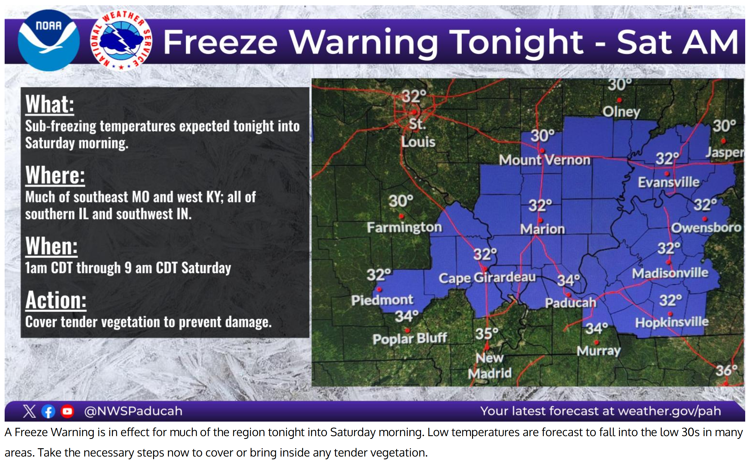 The purple zone is the current freeze warning. Again, keep in mind that counties not included in this could still have frost.