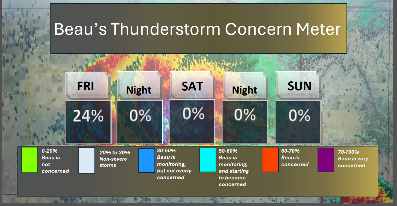 Comments: At this time, tornadoes are not anticipated. Monitor updates. There could be a severe weather threat next week. For now, confidence is low.