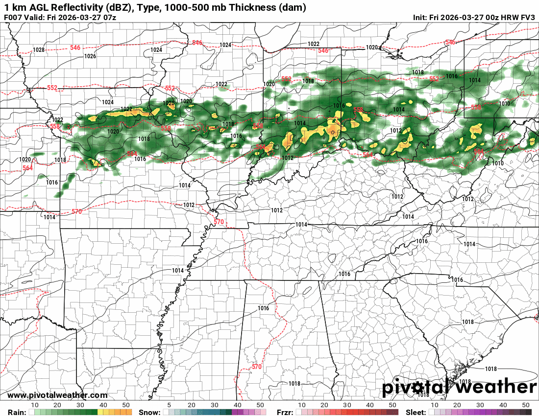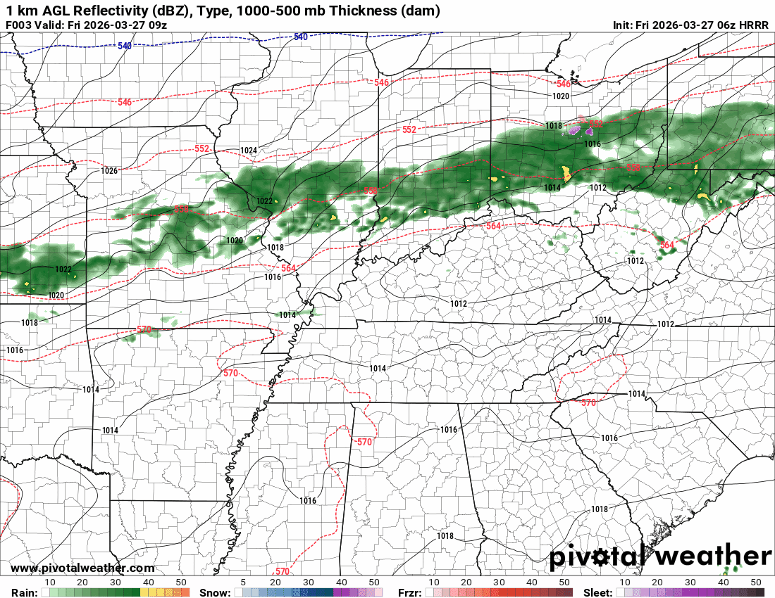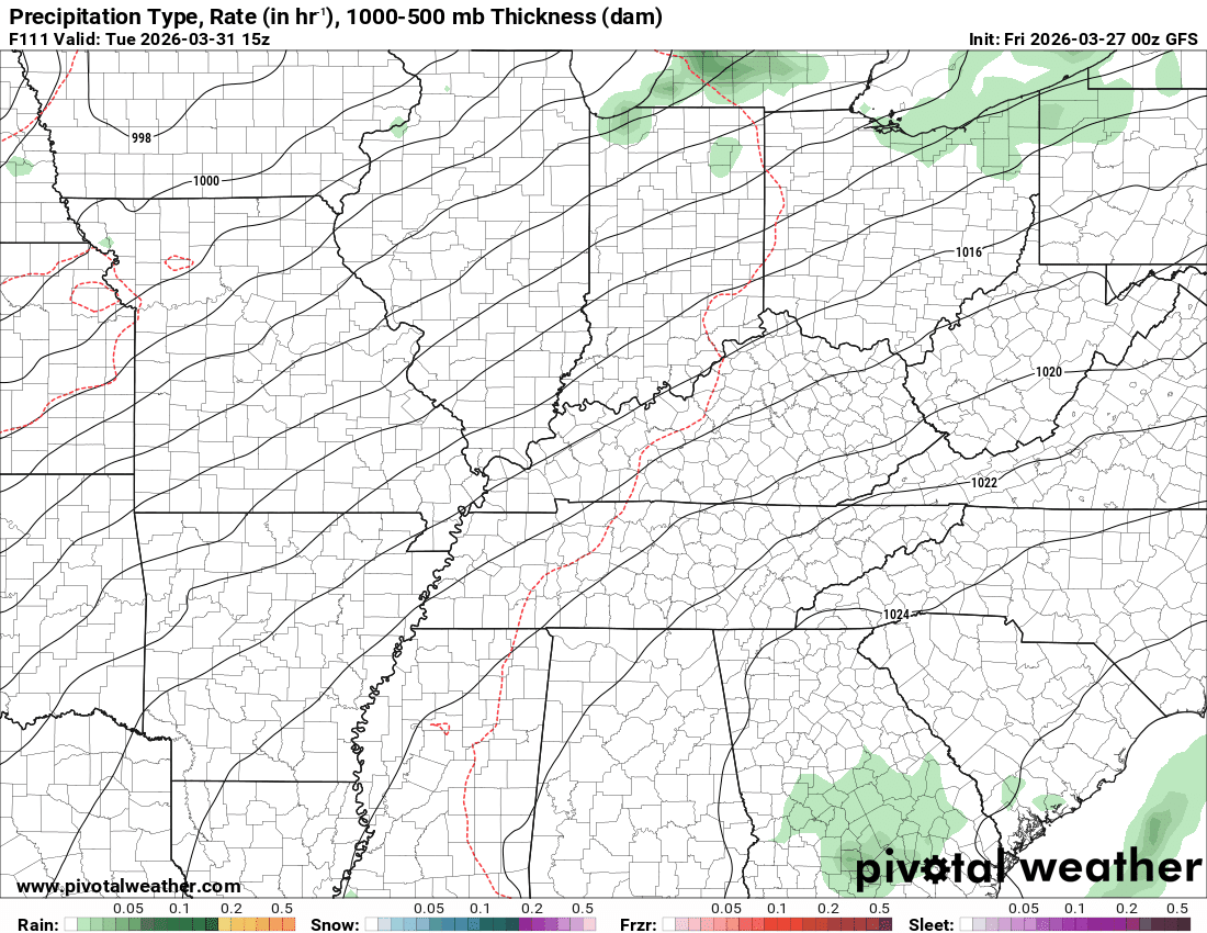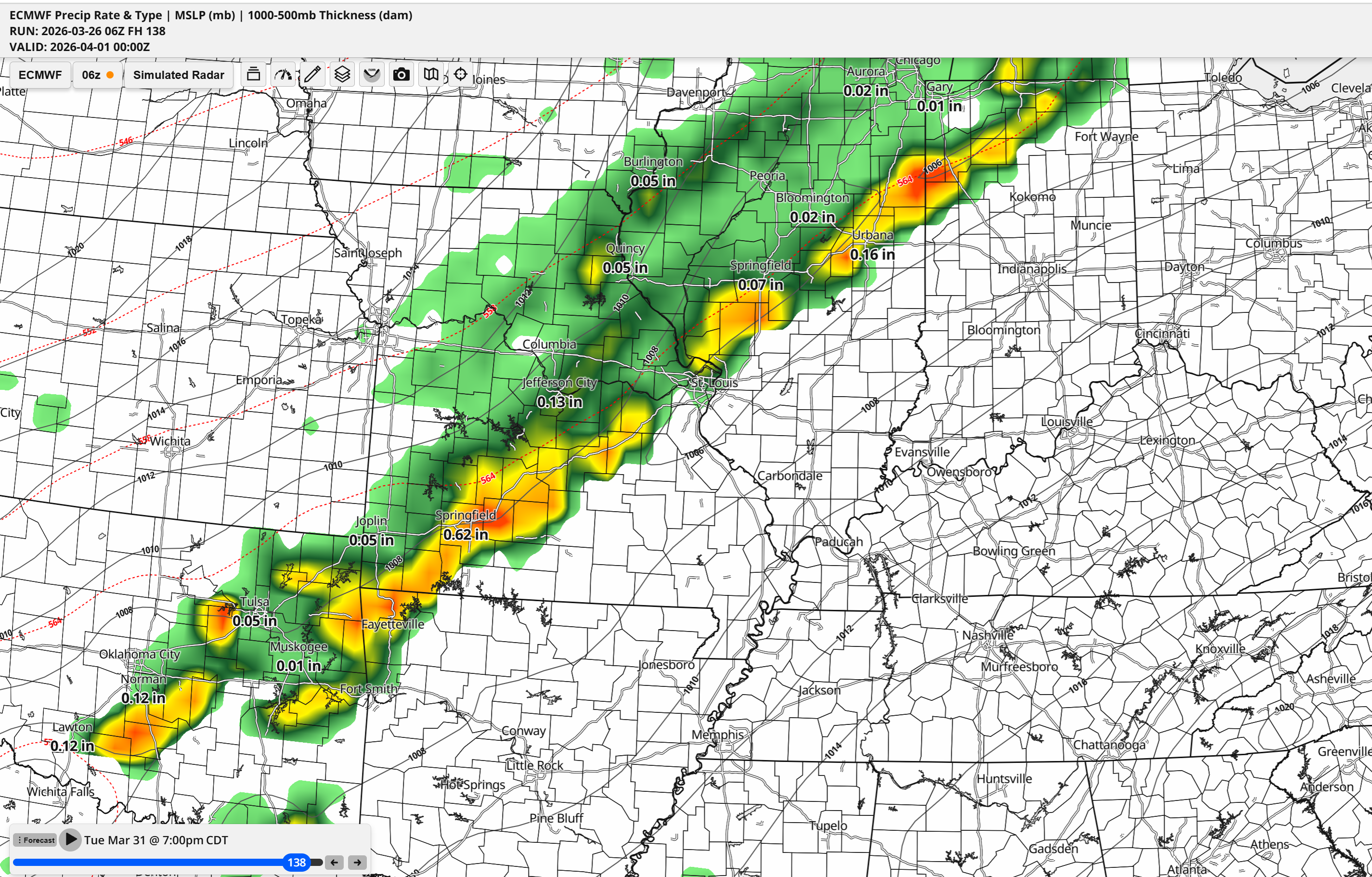 Here is the EC model for next Tuesday evening. It shows a band of showers and thunderstorms pushing eastward into the region.