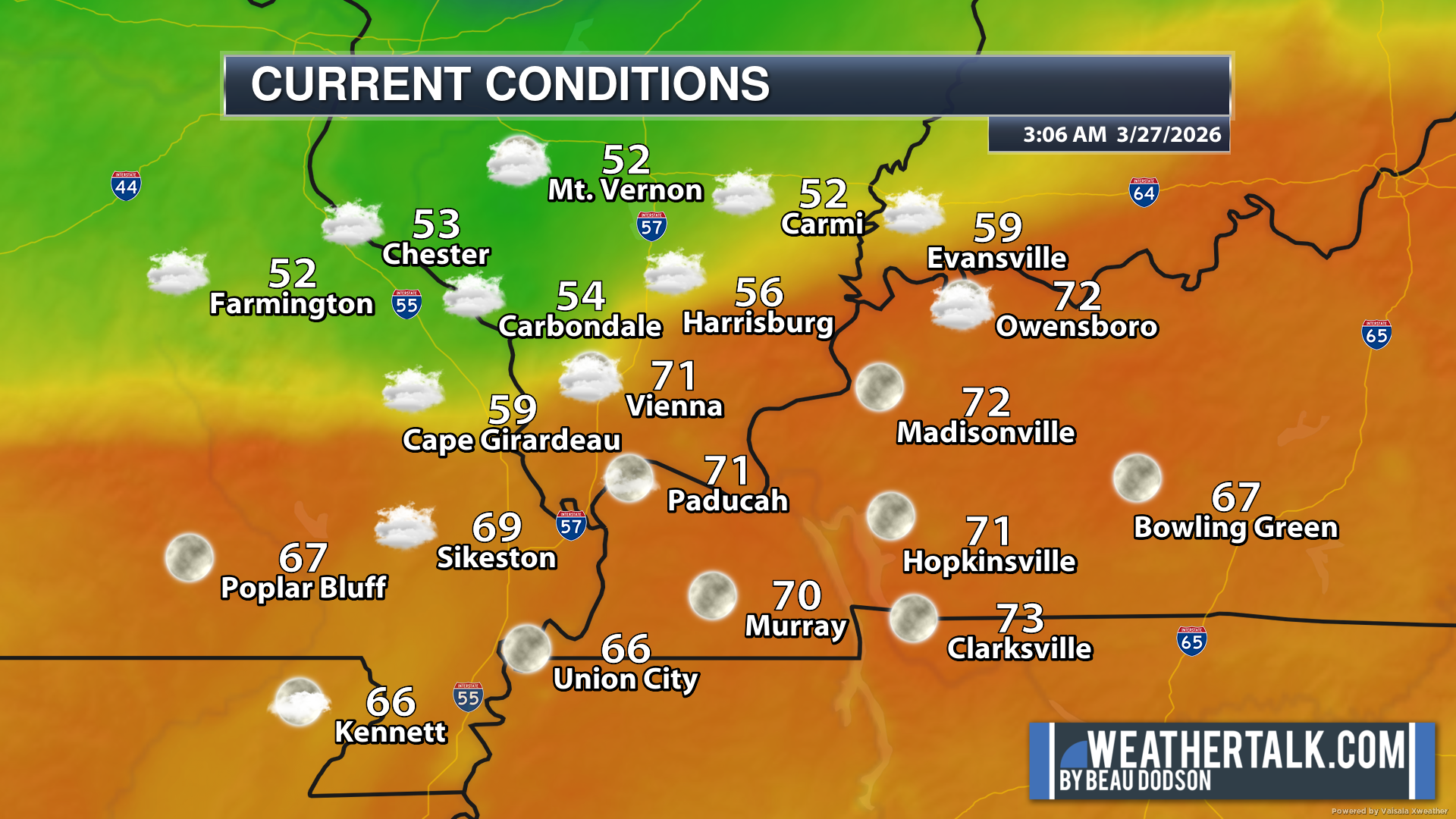 We will have a chance of showers and thunderstorms today. They will taper off from northwest to southeast as we move through the day. Temperatures will also fall as the front moves through your area.