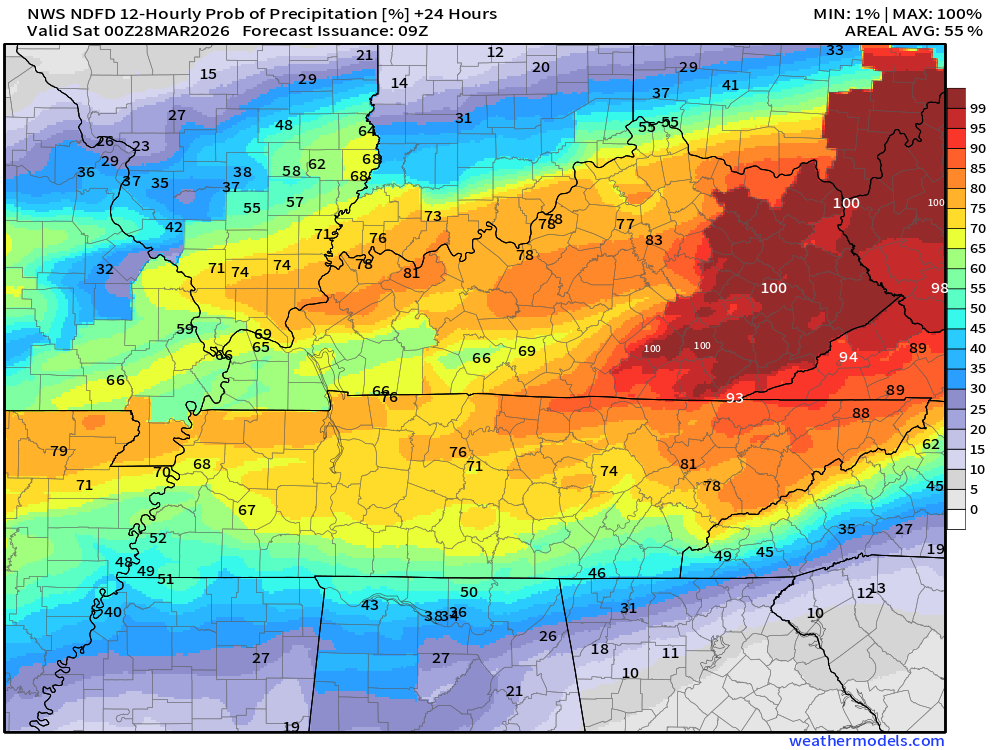 Let’s take a look at the rainfall probabilities. What is the % chance of showers and thunderstorms?