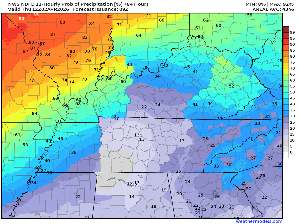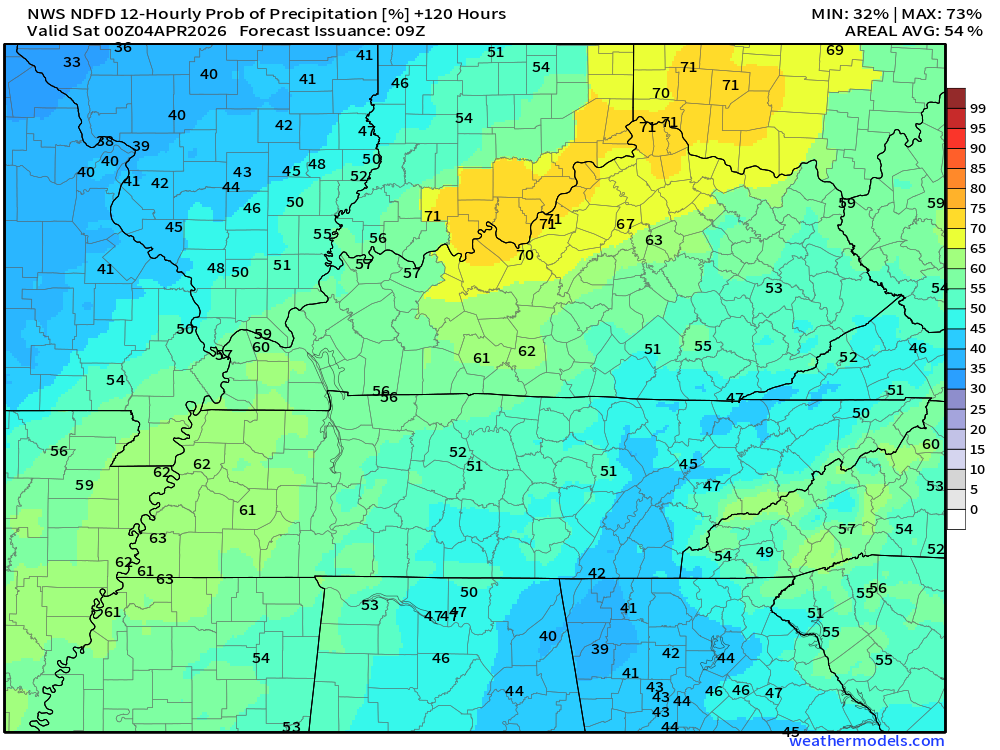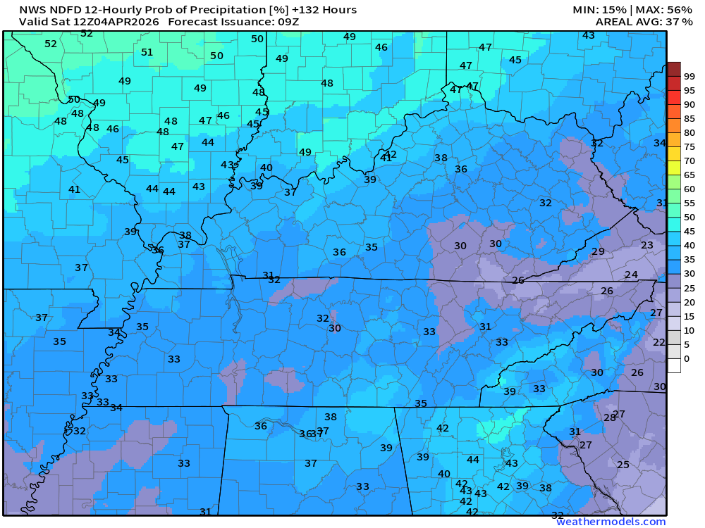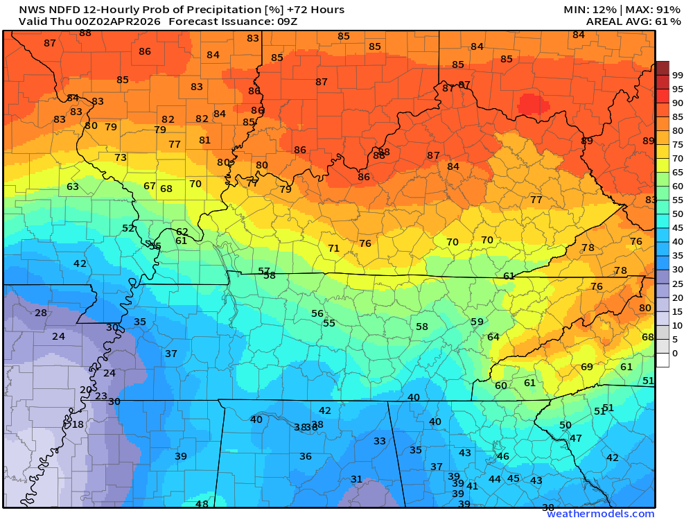 Keep in mind, this is a series of systems.  Rain coverage will ebb and flow.  Higher during some twelve-hour periods and lower during some twelve-hour periods.