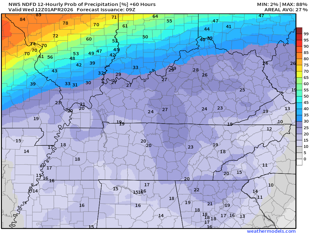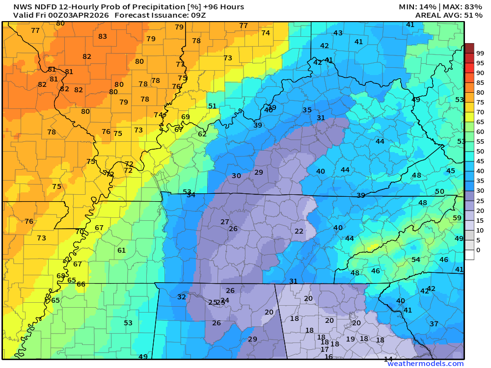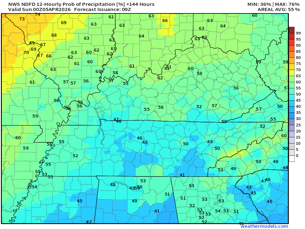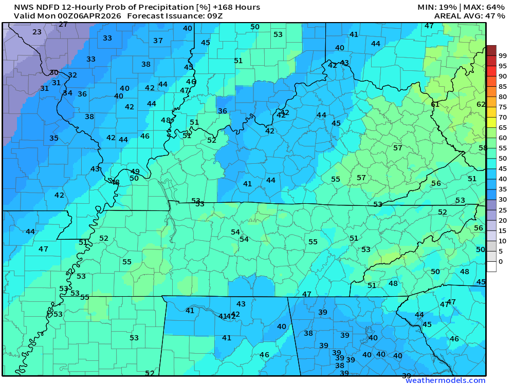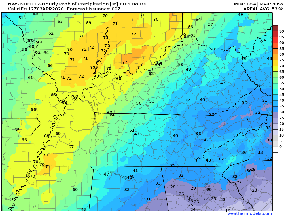 Keep in mind, this is a series of systems.  Rain coverage will ebb and flow.  Higher during some twelve-hour periods and lower during some twelve-hour periods.