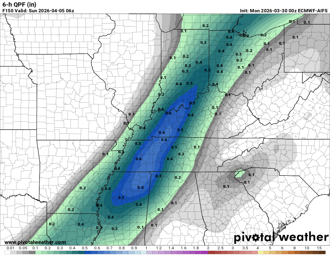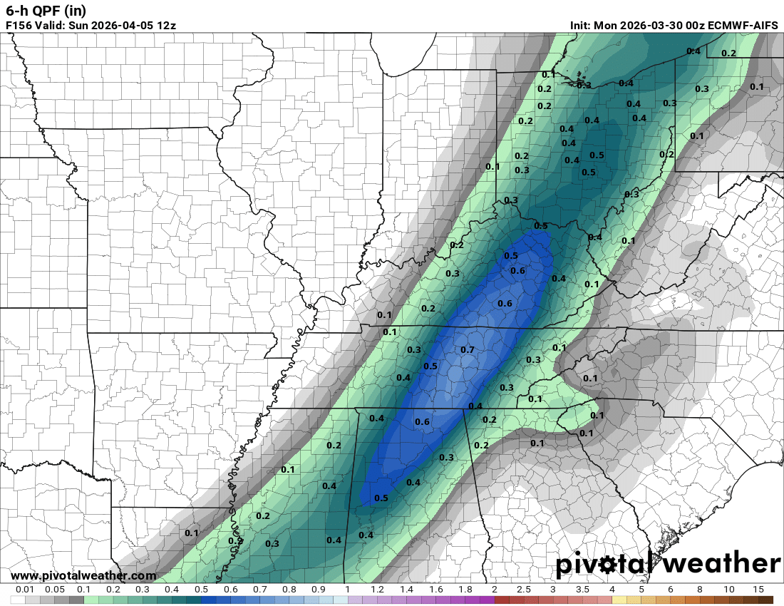 Here is the EC AI model.  It shows the six-hour rainfall totals from 7 PM Saturday to 1 AM Sunday.  If this holds, then the rain will exit late Saturday night.  Pushing off to the east.  I will be monitoring trends in the guidance.