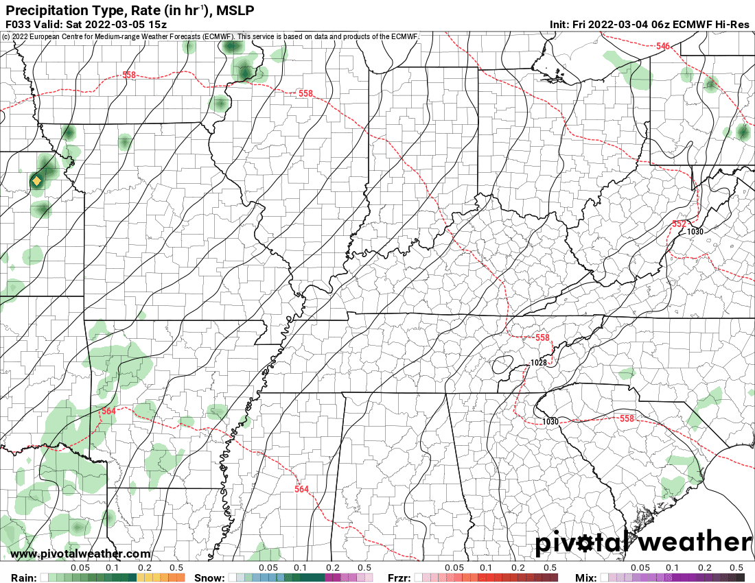 Temperature range: MO Bootheel 33° to 36° / SE MO 28° to 34° / I-64 Corridor of South IL 28° to 32° / South IL 30° to 35° / Northwest KY (near Indiana border) 34° to 36° / West KY 34° to 36° / NW TN 35° to 40°