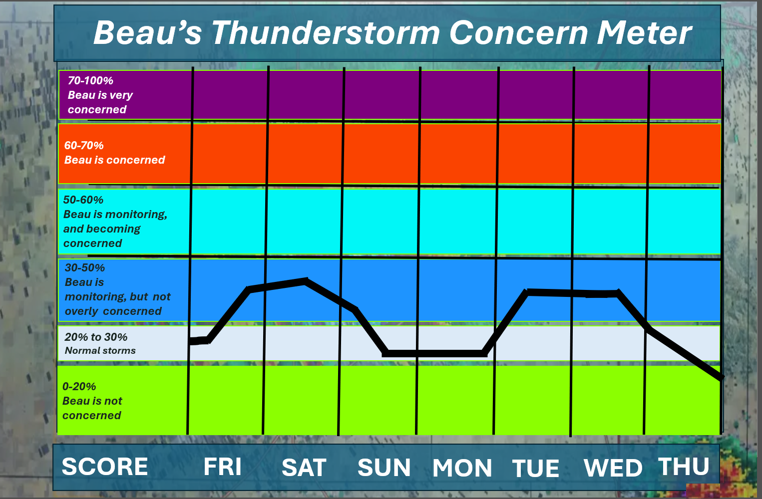 I am monitoring Friday night and Saturday for strong storms. I am monitoring Tuesday and Wednesday of next week.