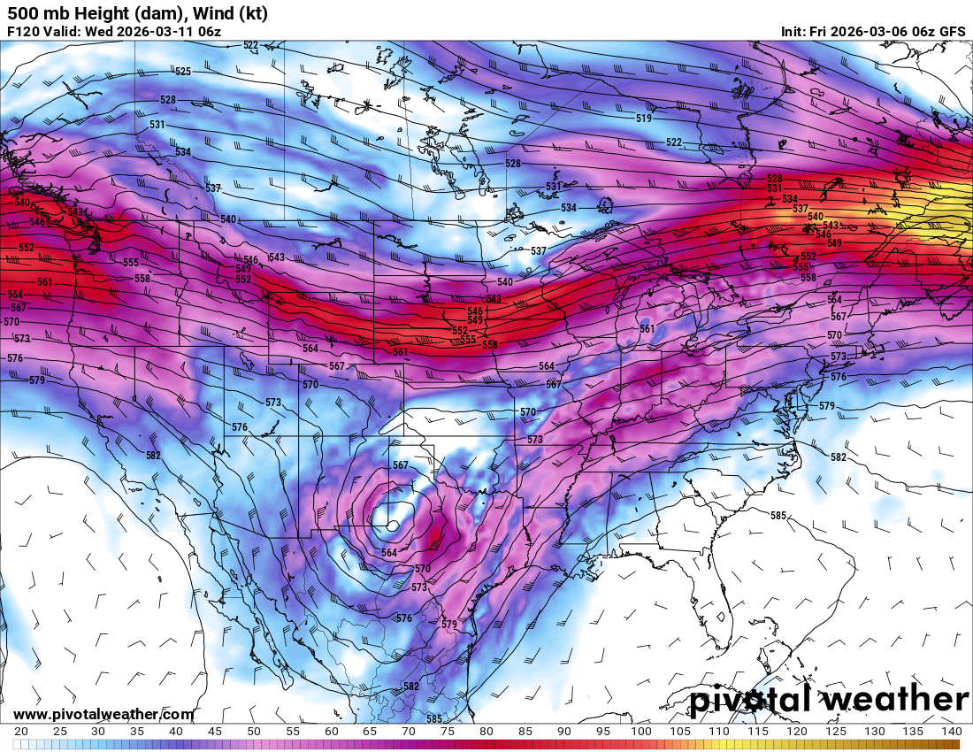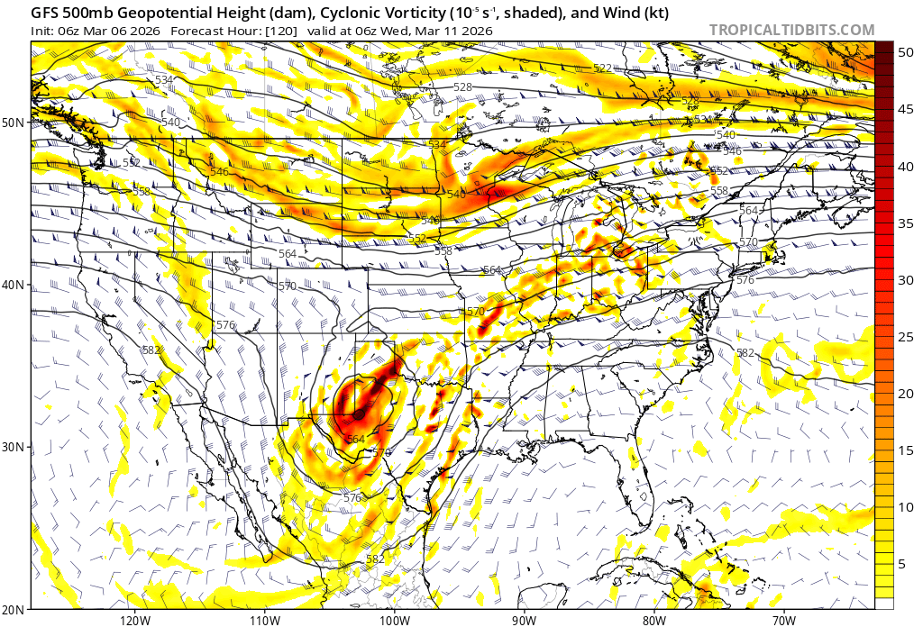 Here is the vort max (energy) map. A low over Texas will help pump warm air into our region.