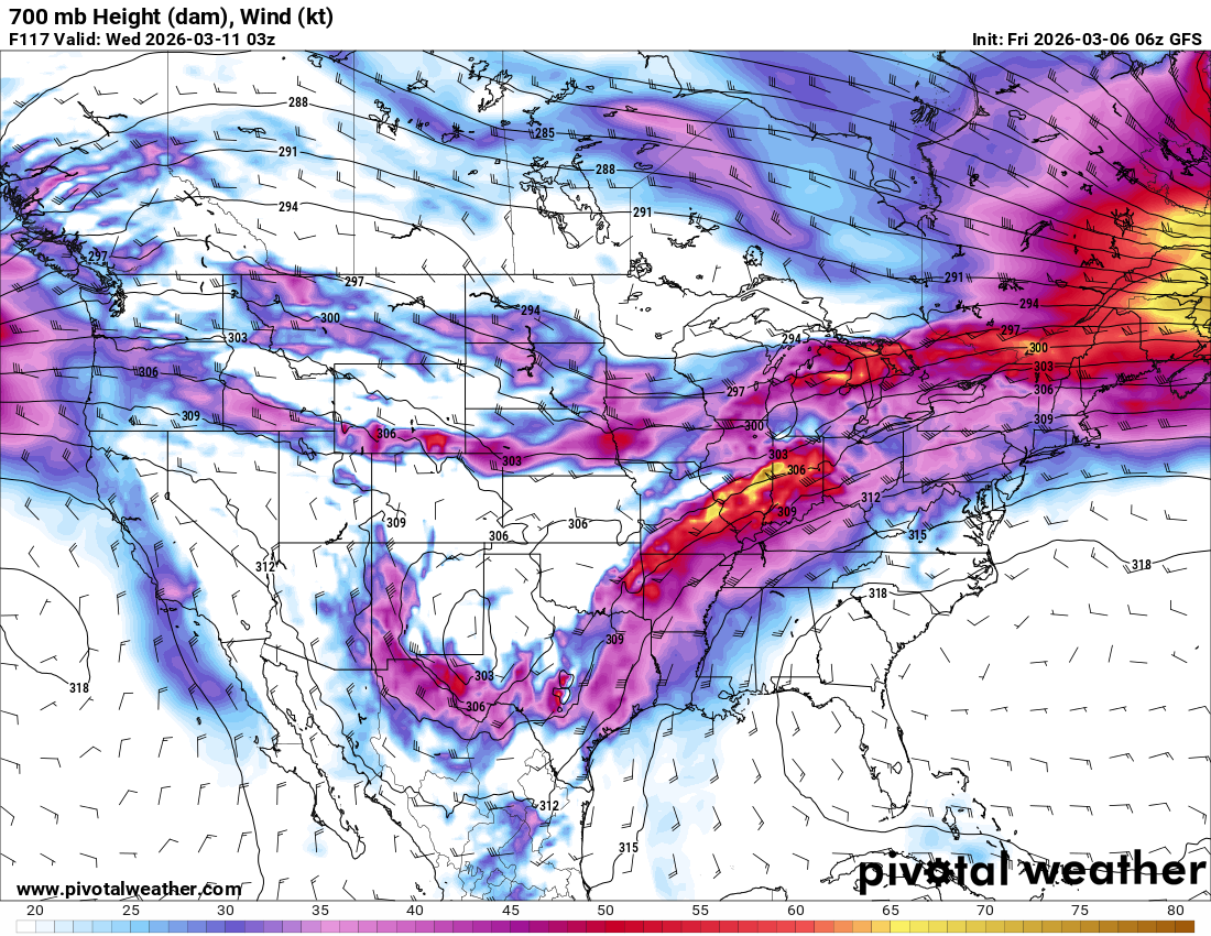 Here are the wind fields for next Tuesday and Tuesday night. These graphics show you the low-level jet stream and the mid-to-upper-level jetstream.