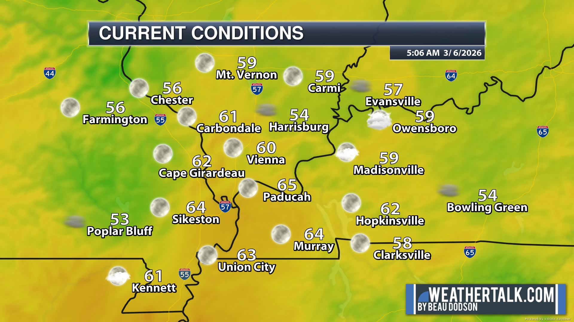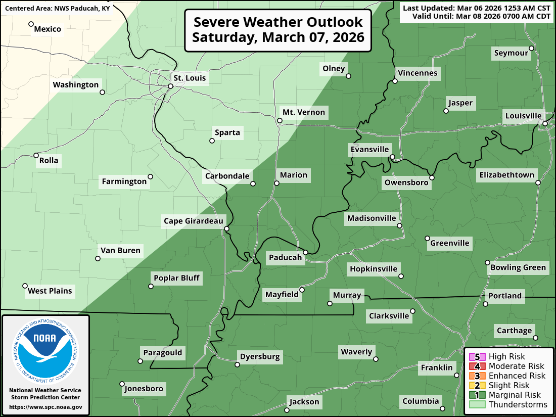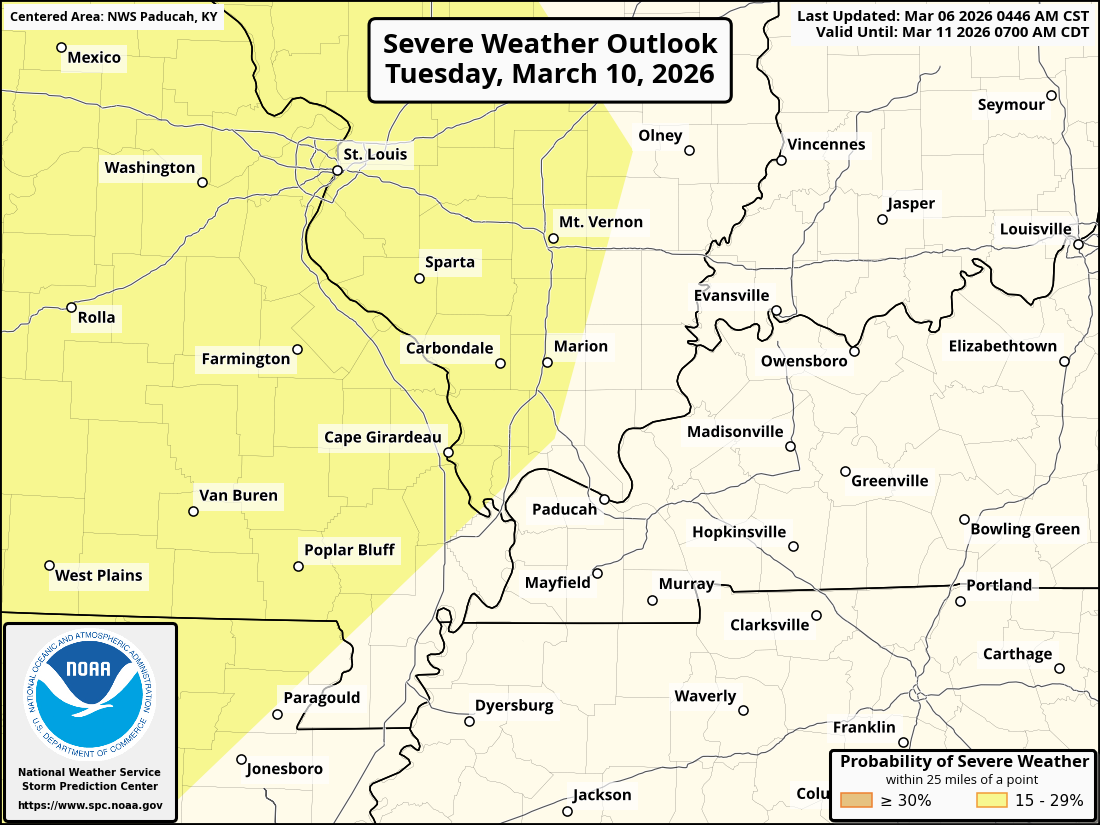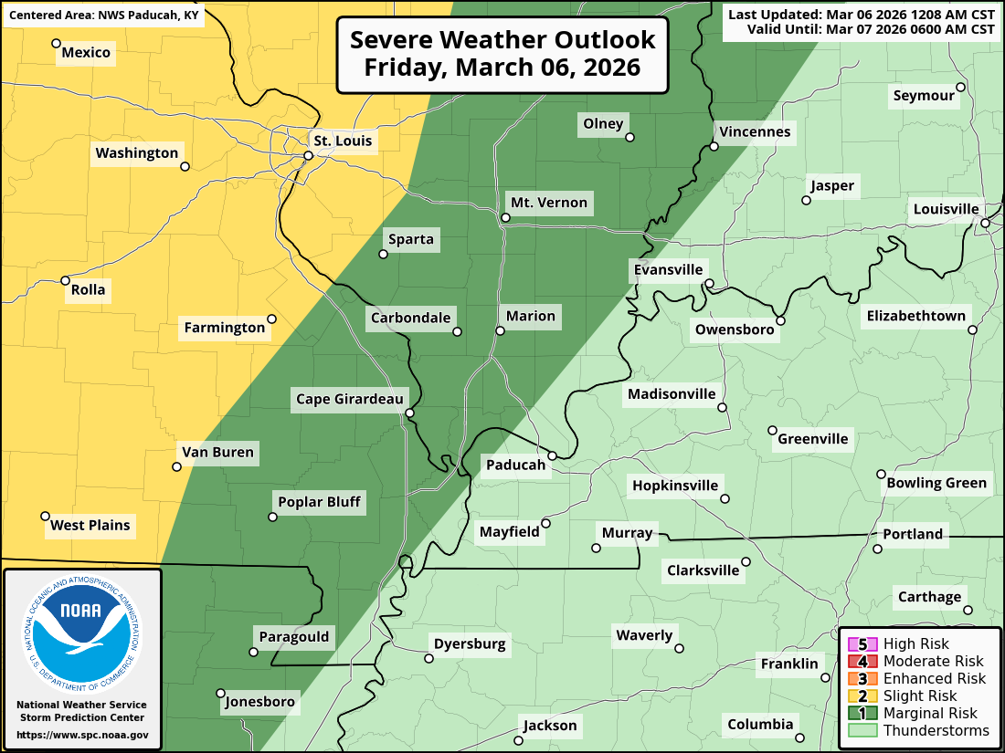 As you can see, the risk locally is low. Perhaps a bit higher chance as you drive west in the region. Mainly over southeast Missouri and far southwest Illinois.