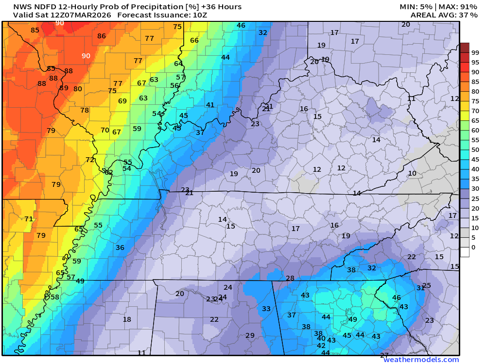 - Shower and thunderstorm chances into Saturday. Peak chances will be late tonight into Saturday.