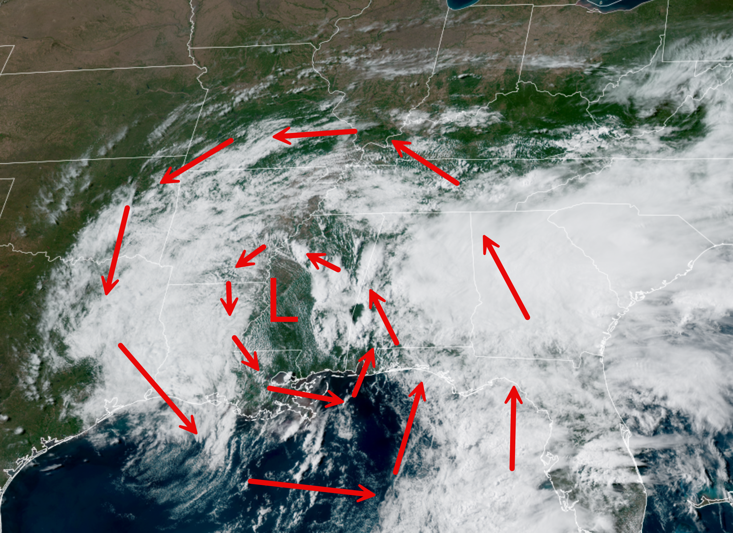 If the low is to our south, our rain moves southeast to northwest.  Spinning around the area of low pressure.