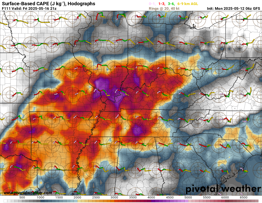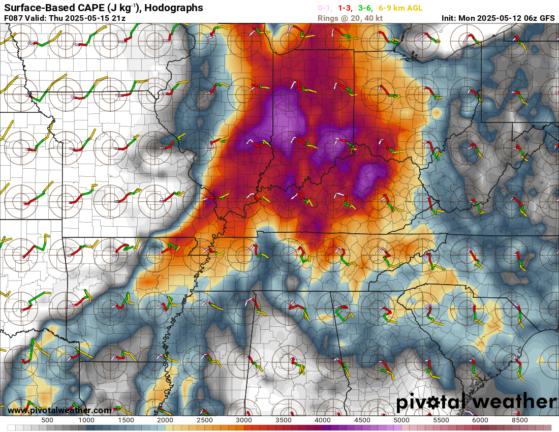 Here are the CAPE levels on Thursday.  These are high numbers.  Plenty of unstable air, but questions remain on whether storms will form during the day.  A strong cap could help prevent storms.  Not a lock, but it is something that I am monitoring.