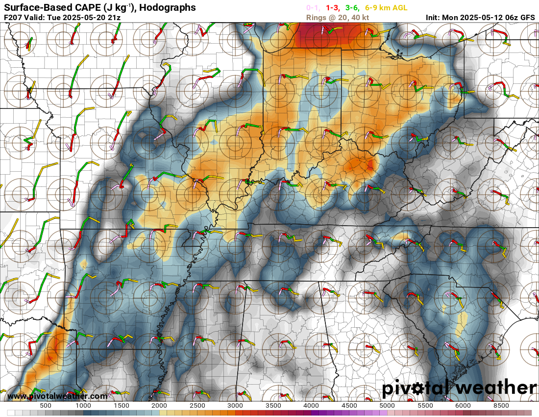 Here are the CAPE numbers for next Tuesday.  Not as high, but wind shear may be higher.  Severe weather is possible next week along the cold front.