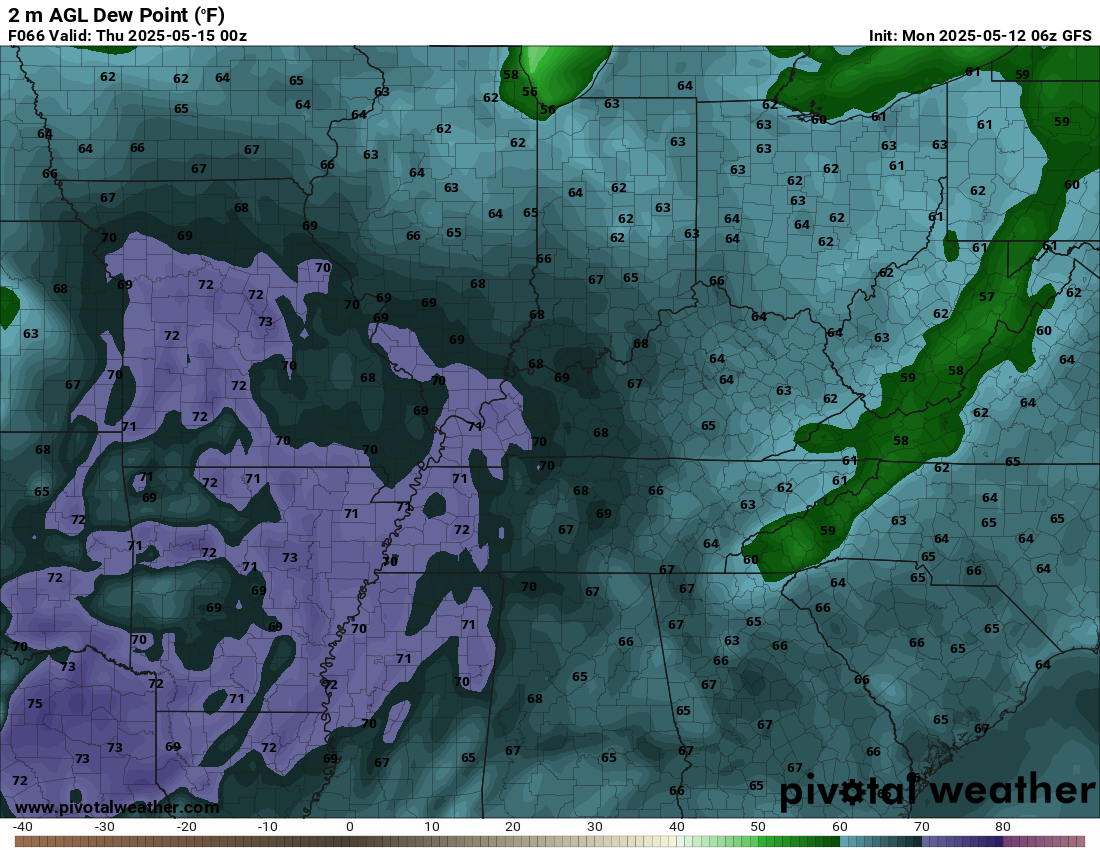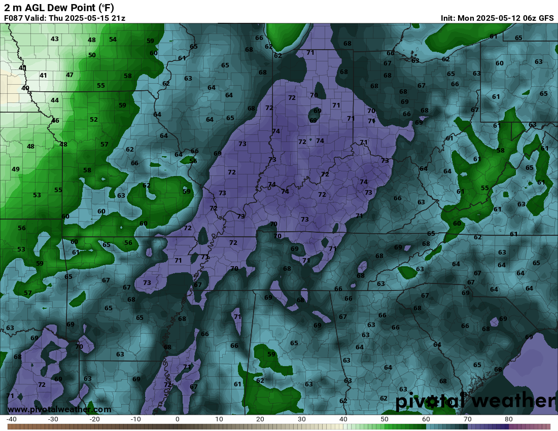 Dew points are a measure of moisture.  Those high dew points will help build an unstable atmosphere, as well.  Thunderstorms in these dew points will produce heavy downpours, as well (plenty of moisture to tap into).