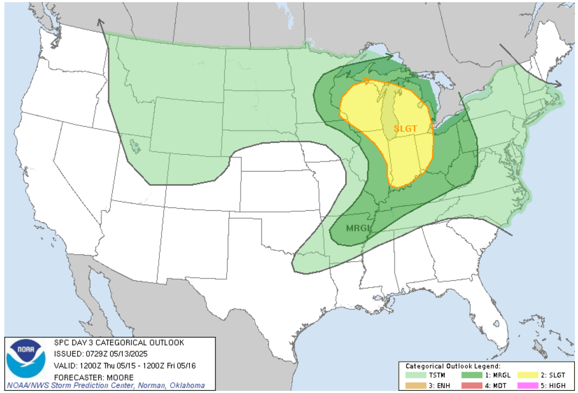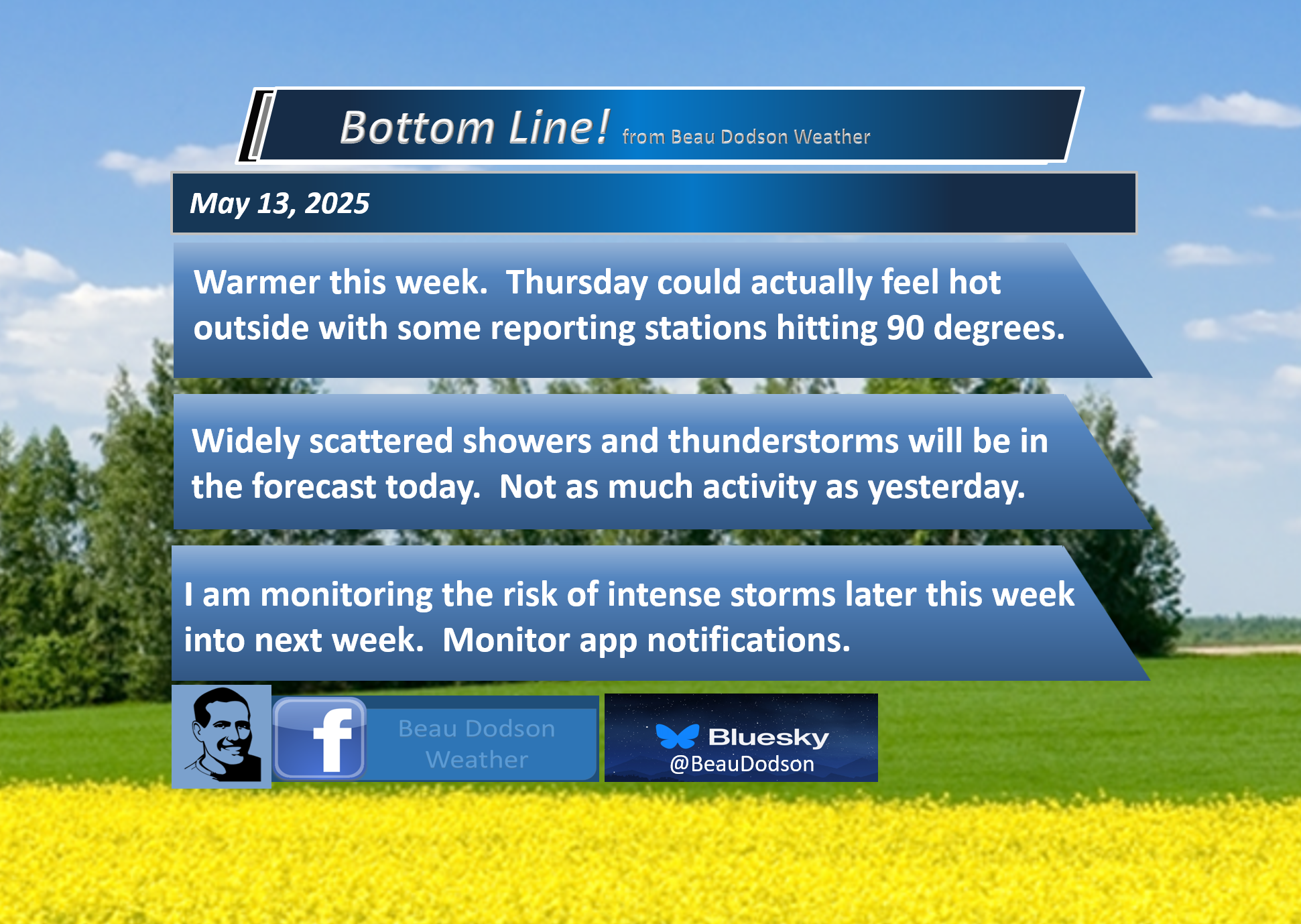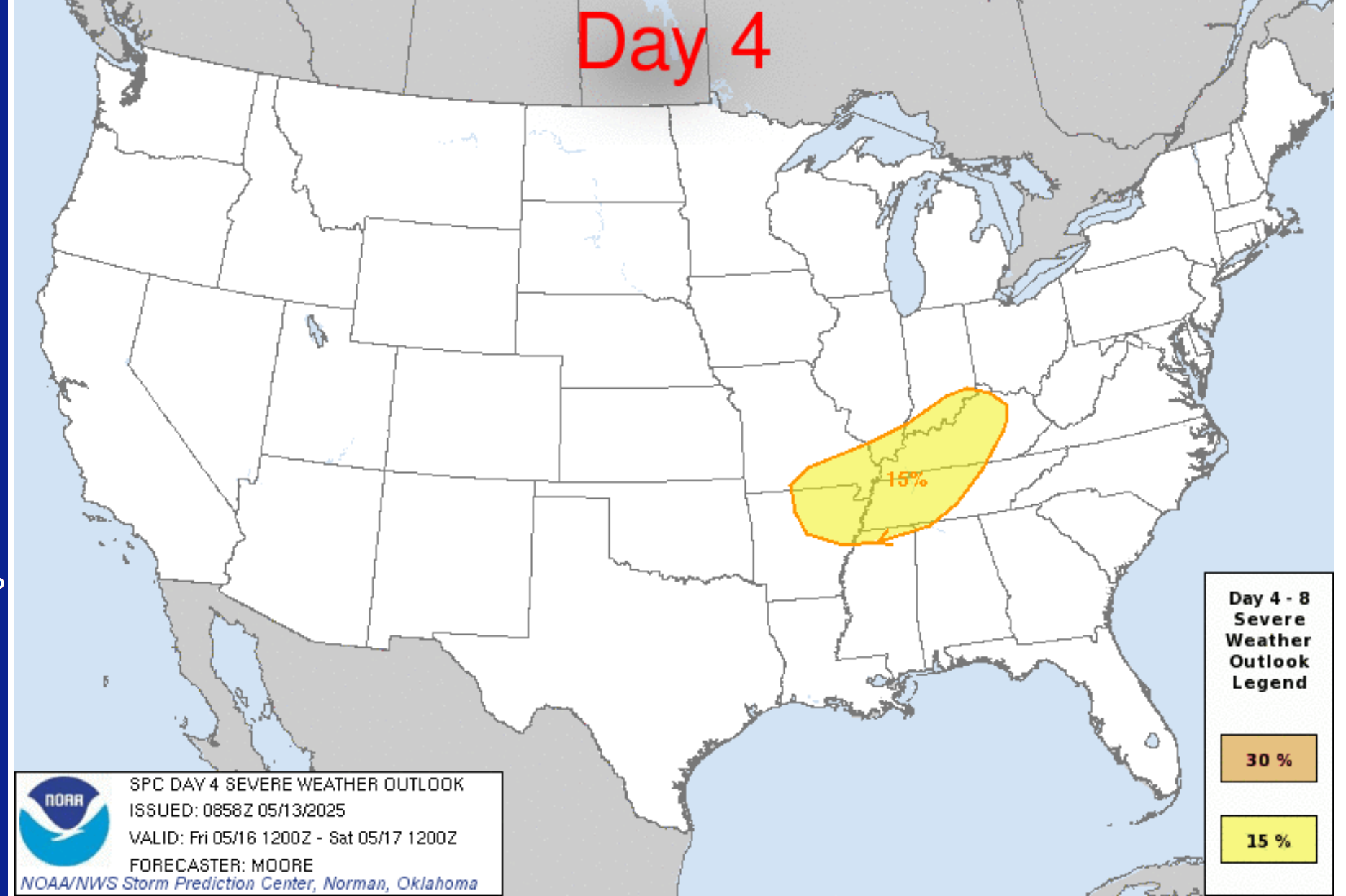 - I am monitoring the risk of severe thunderstorms late this week into next week. Questions remain on timing and placement. Monitor updated forecasts over the coming days. The active weather may continue into late May.