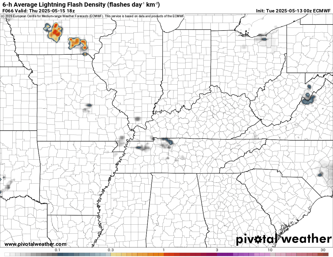 This shows you Thursday through Saturday night. Peak chances of lightning appear to be on Friday/Friday night.