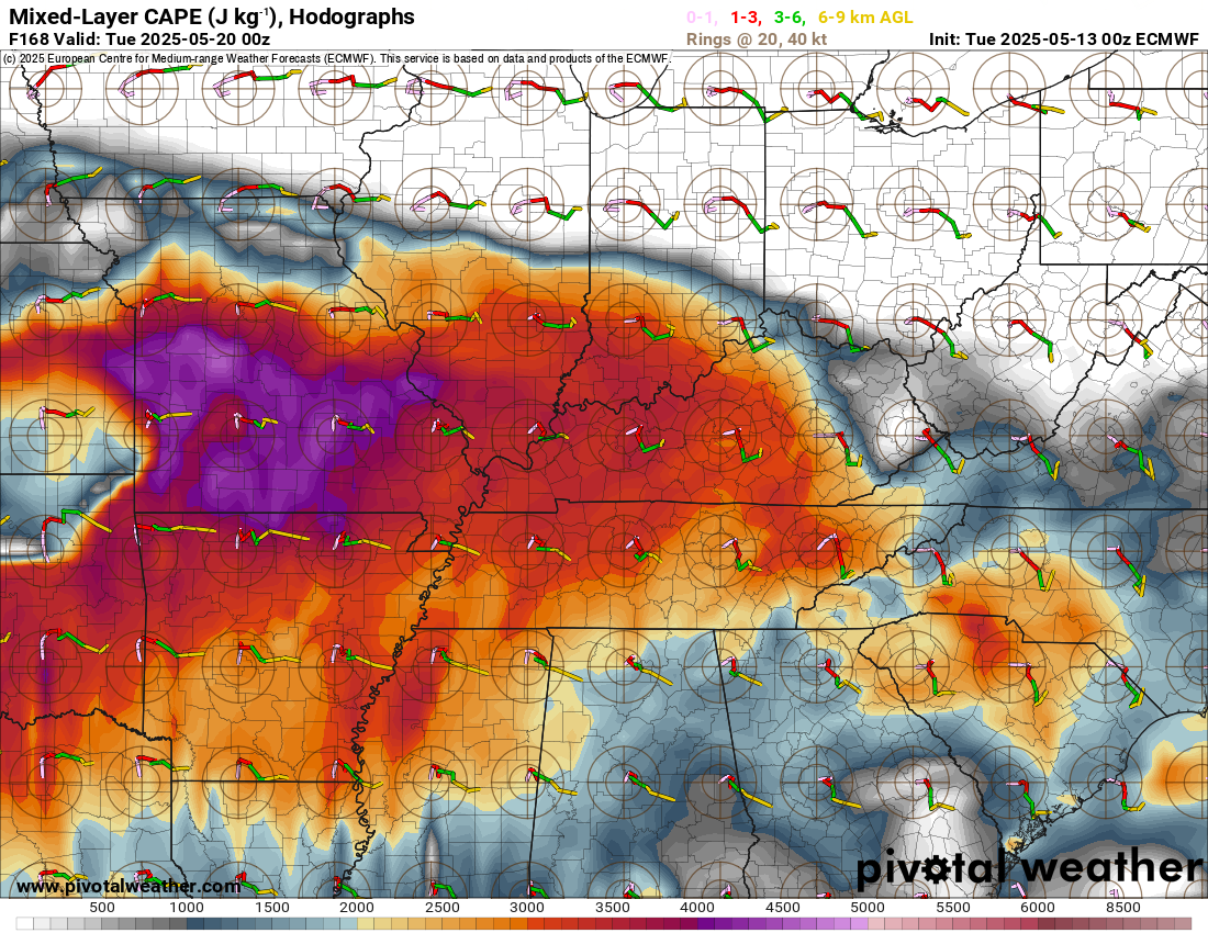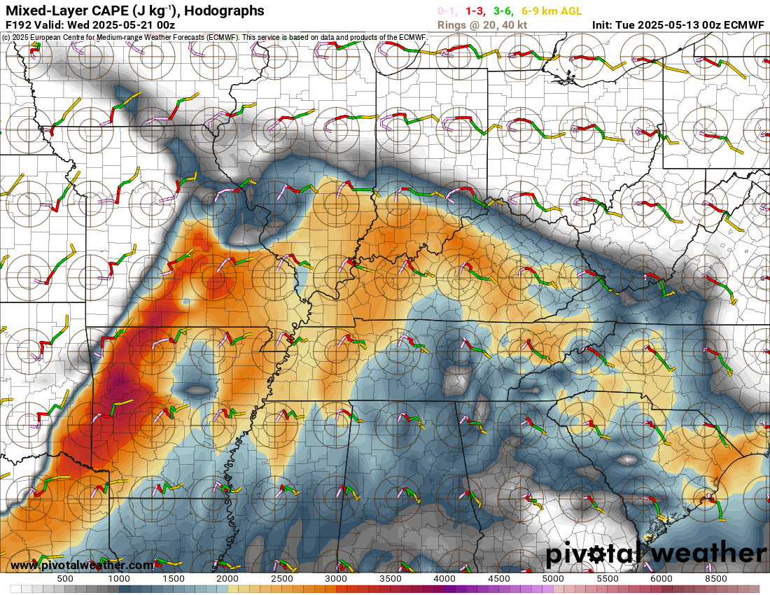 Here are the CAPE numbers for next Monday. Severe weather is possible next week along the cold front.