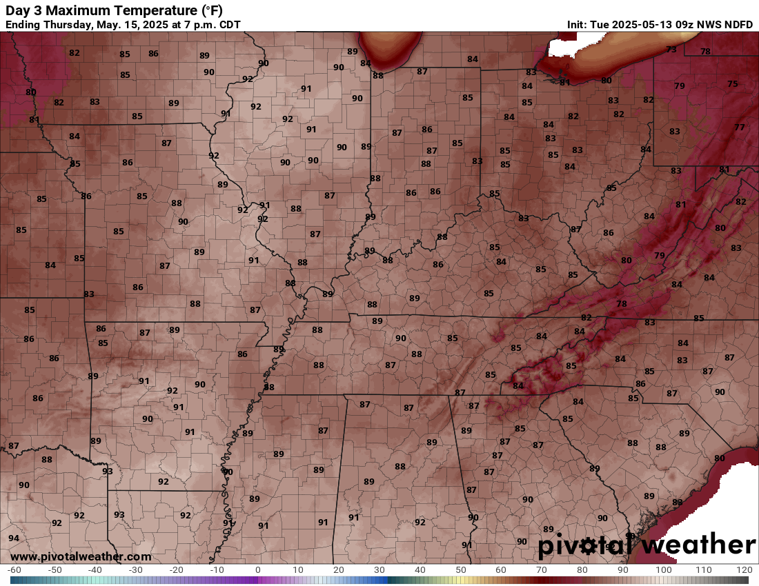 - Some reporting stations will be quite warm on Wednesday and Thursday. Some locations will hit 90 degrees on Thursday! Heat index values will be in the nineties.