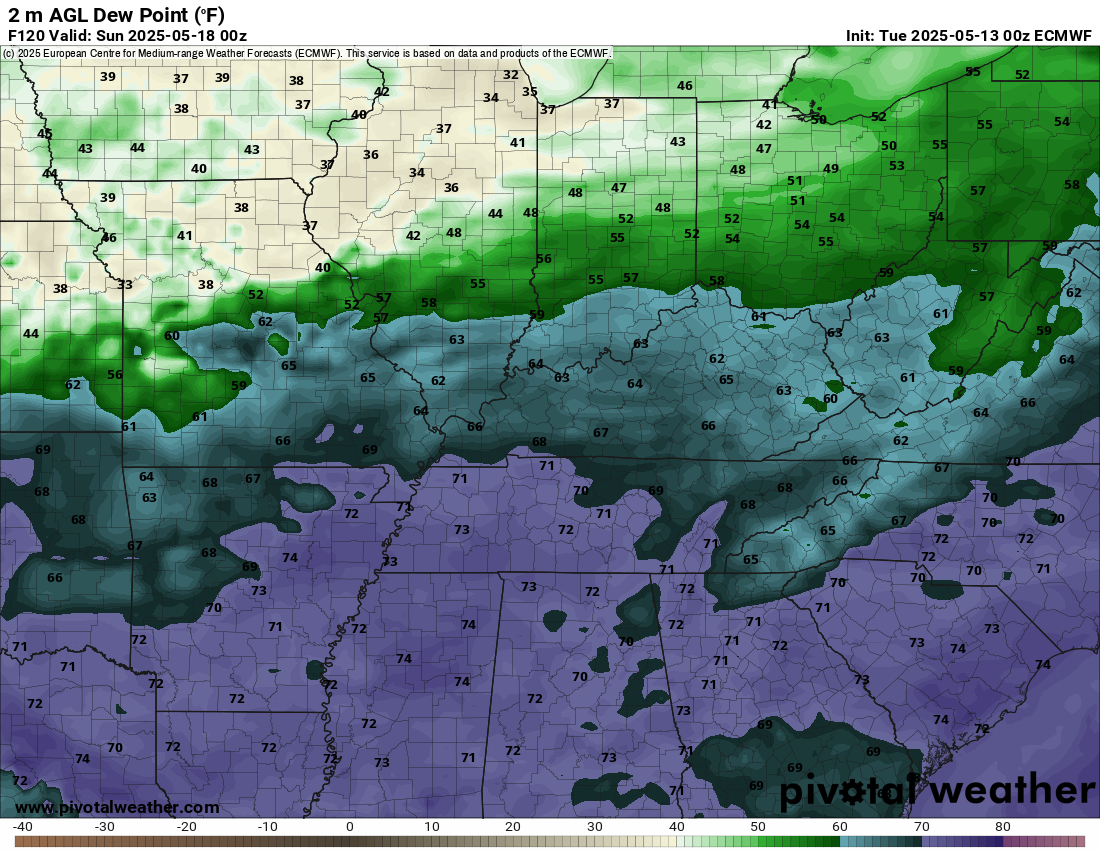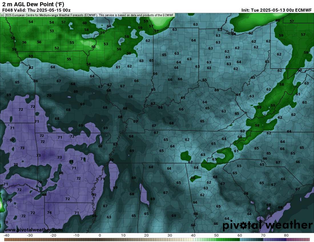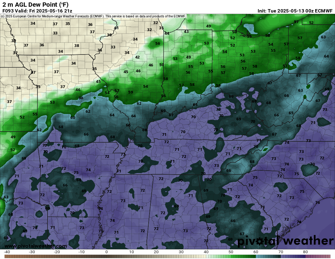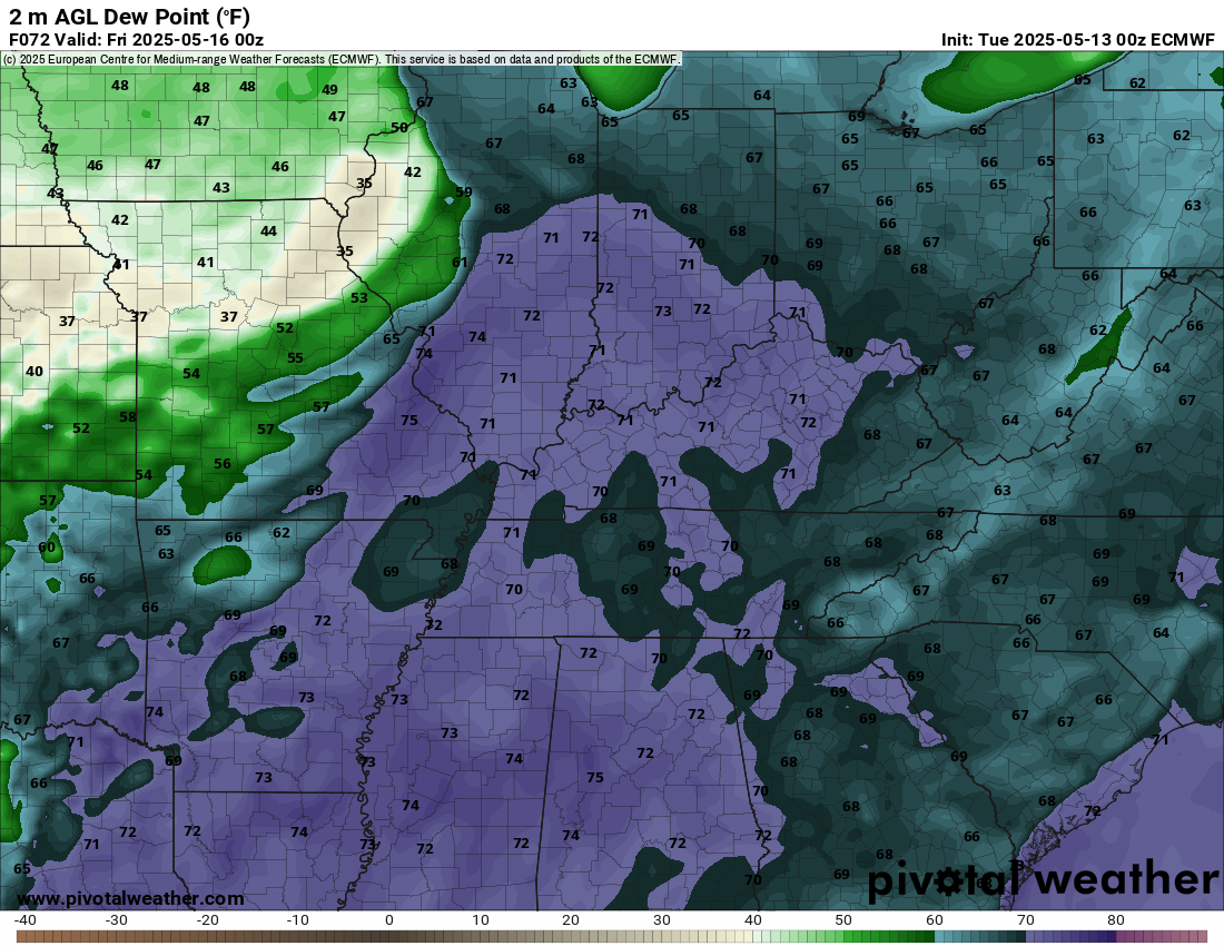 Dew points are a measure of moisture. Those high dew points will help build an unstable atmosphere, as well. Thunderstorms in these dew points will produce heavy downpours, as well (plenty of moisture to tap into).