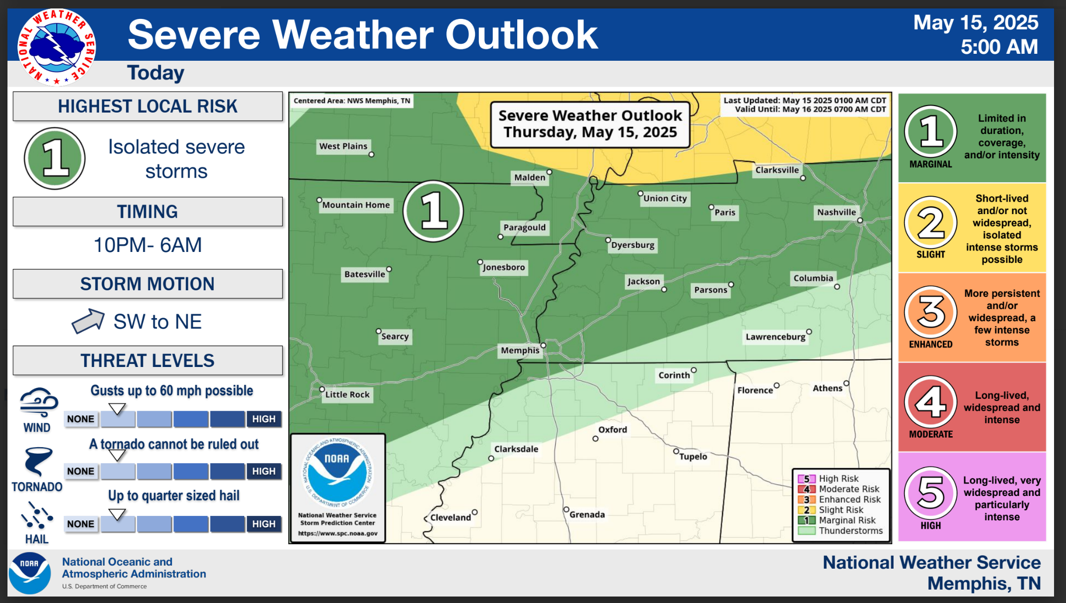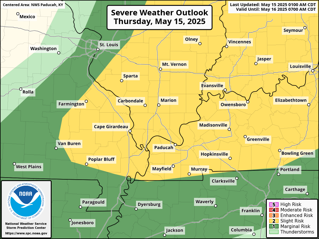 Here is the Storm Prediction Center’s latest severe weather outlook for Thursday. This is a level one and two severe weather risk. Dark green is the level one risk. Yellow is the level two risk.
