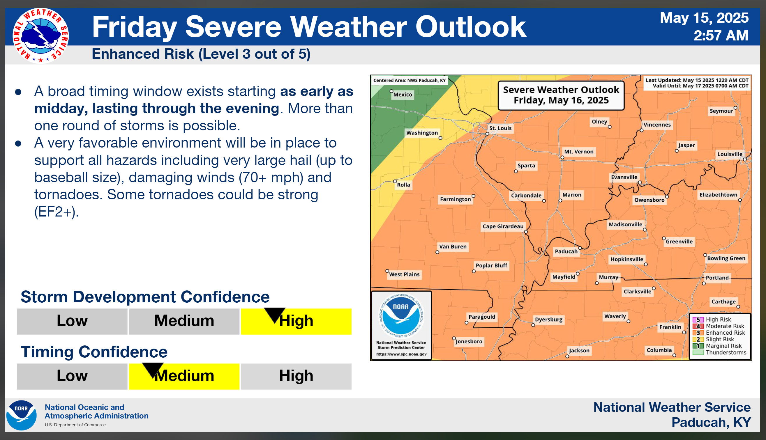 Severe thunderstorms are likely on Friday and Friday night. Some storms could produce baseball size hail, 80 mph wind gusts, and tornadoes. Stay weather aware. Numerous warnings are likely on Friday and Friday night.