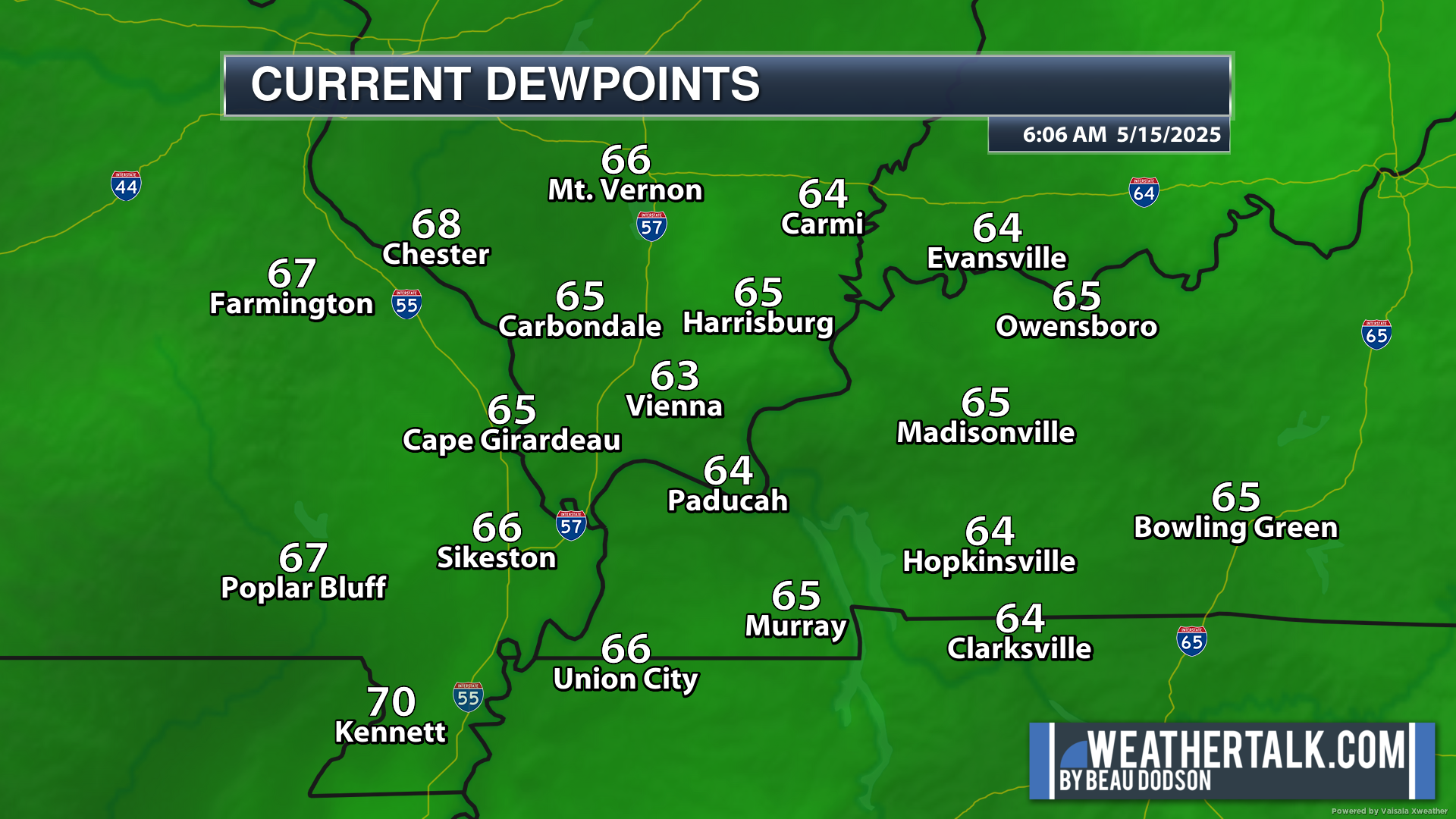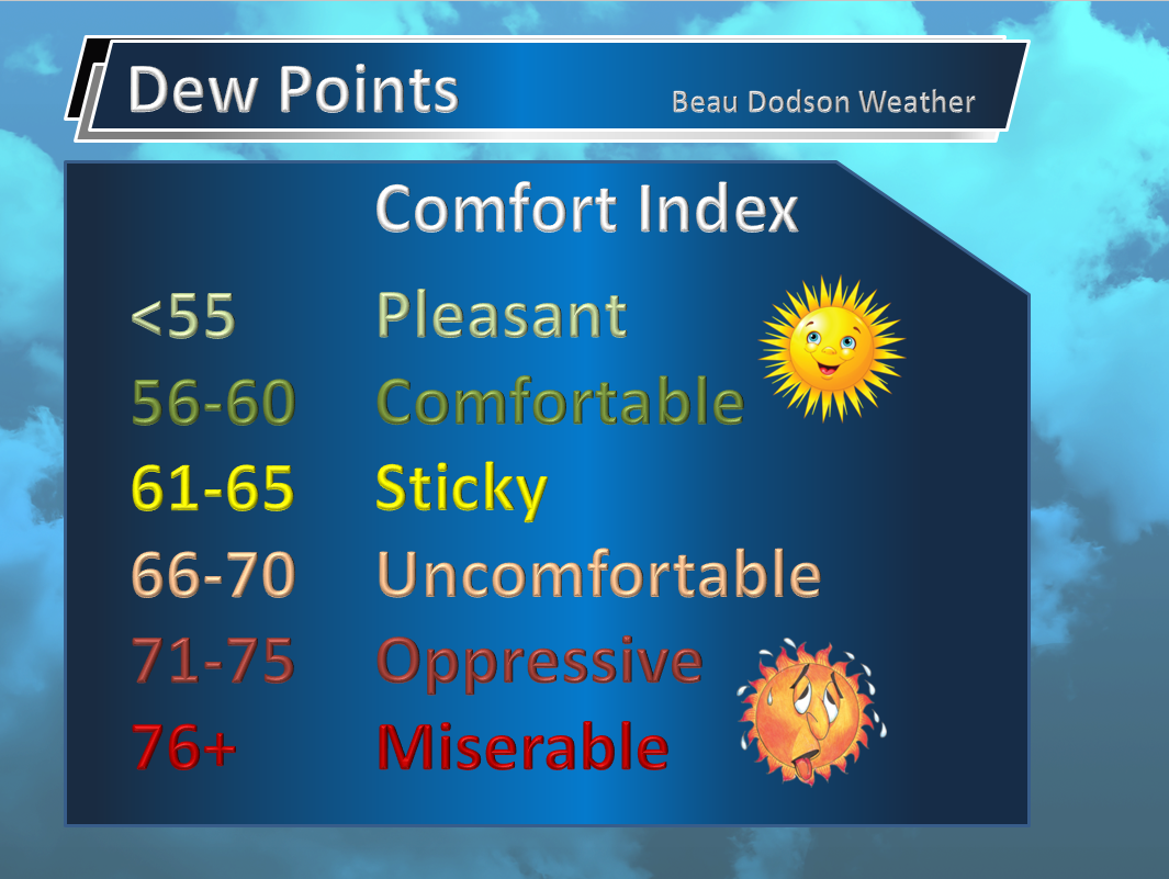 Dew points are a measure of moisture. Those high dew points will help build an unstable atmosphere, as well. Thunderstorms in these dew points will produce heavy downpours, as well (plenty of moisture to tap into).