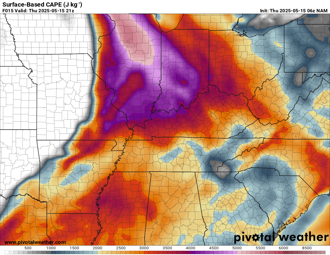 Here are the CAPE levels on Thursday. These are high numbers. Plenty of unstable air, but questions remain on whether storms will form during the day. A strong cap could help prevent storms.