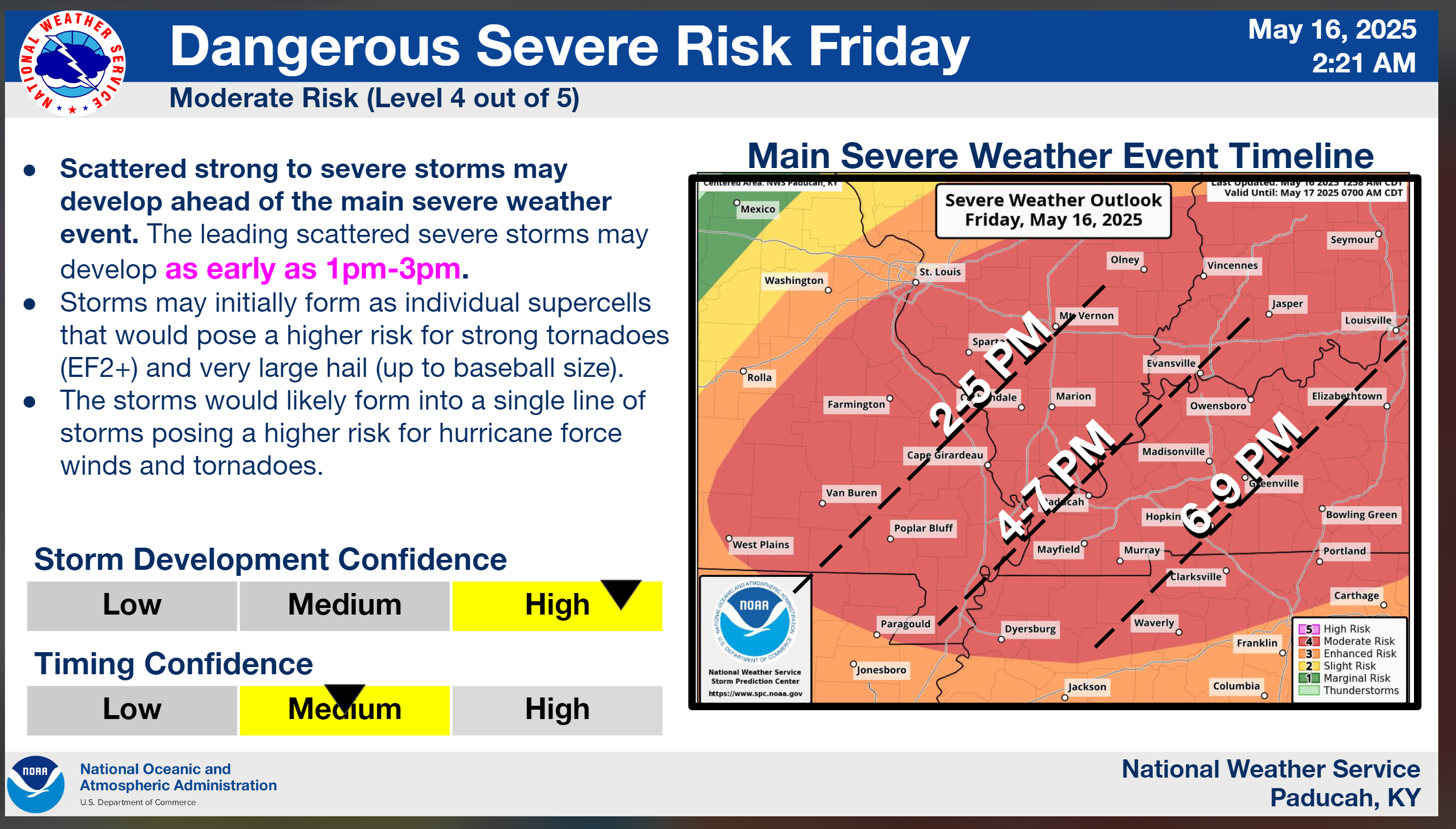 The timing is HIGHLY uncertain.  Supercells could form well ahead of the cold front.  That would throw off the times.  Keep that in mind.
