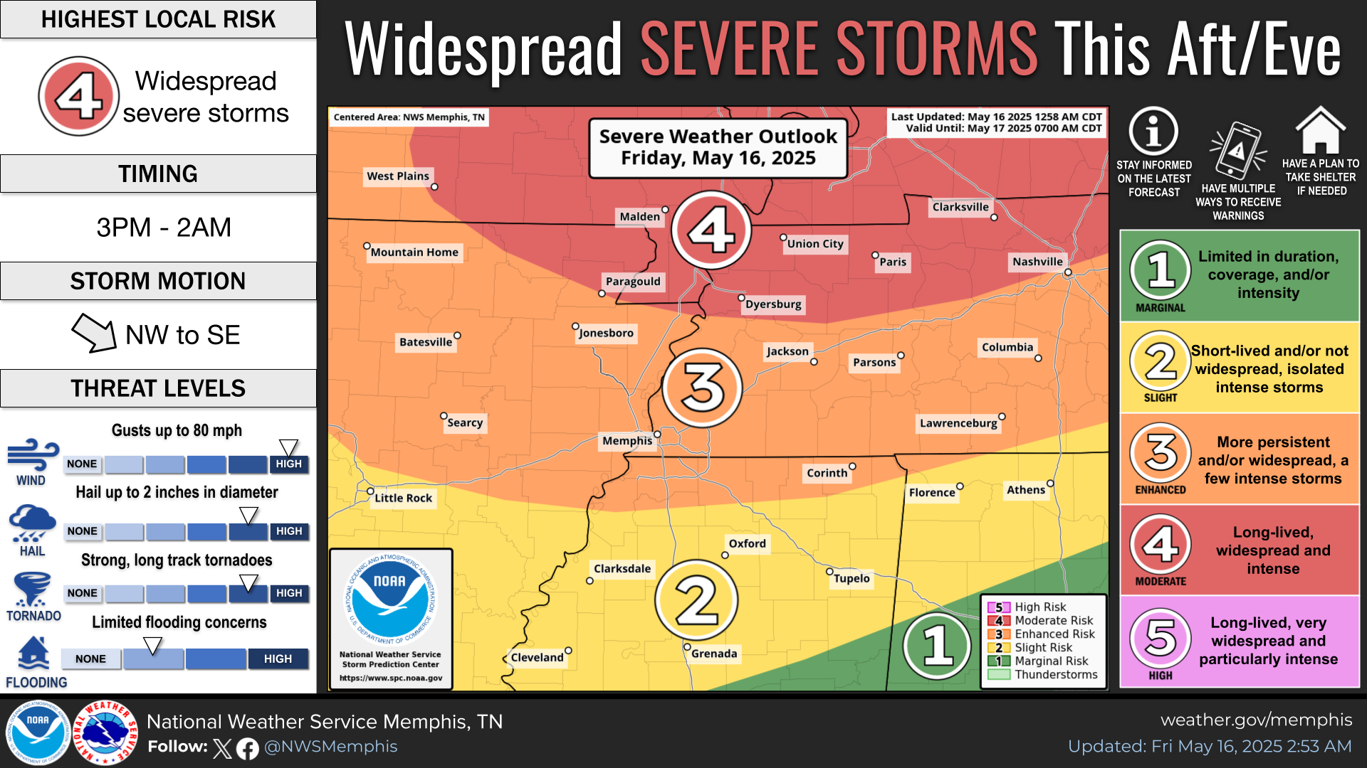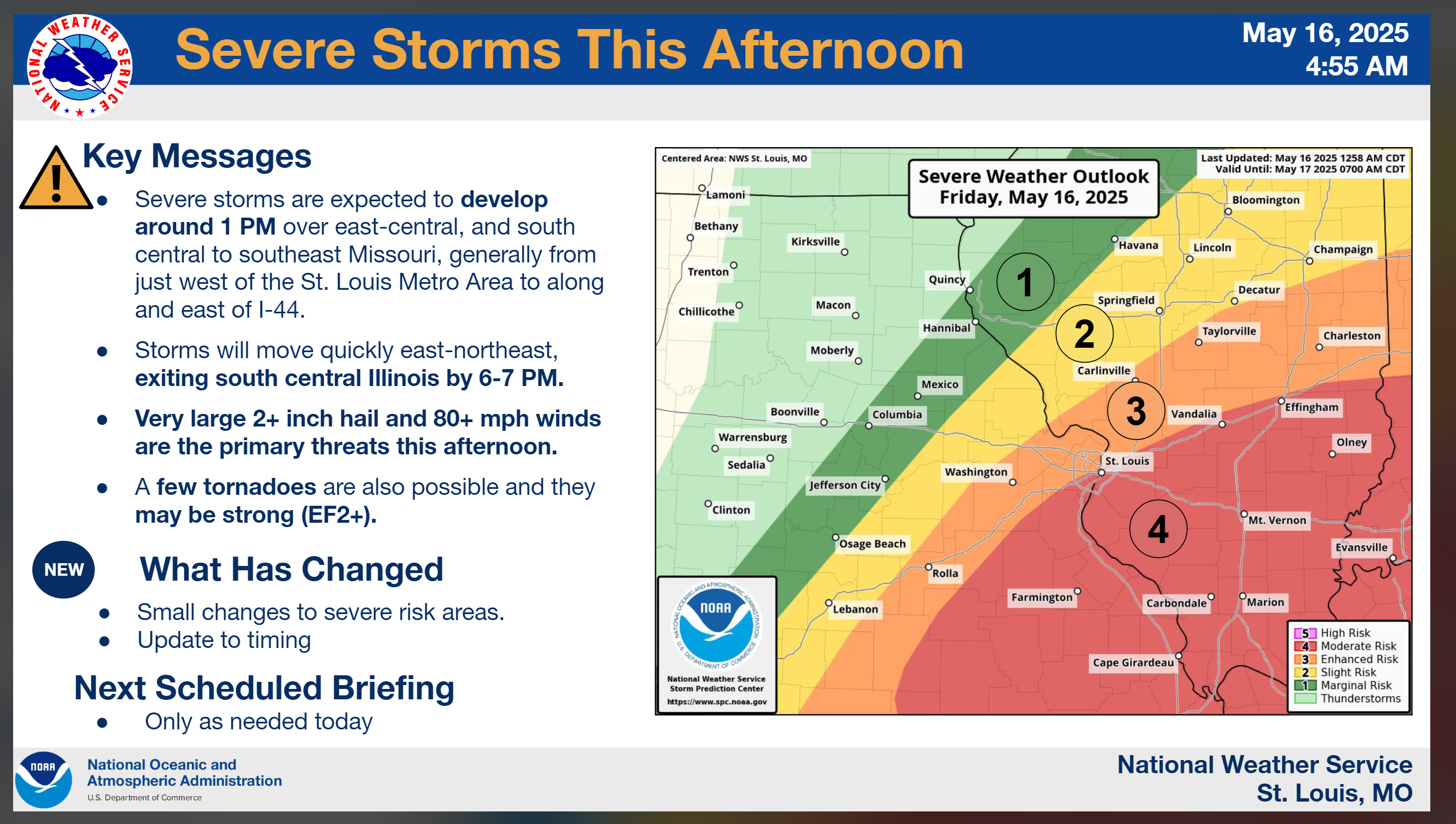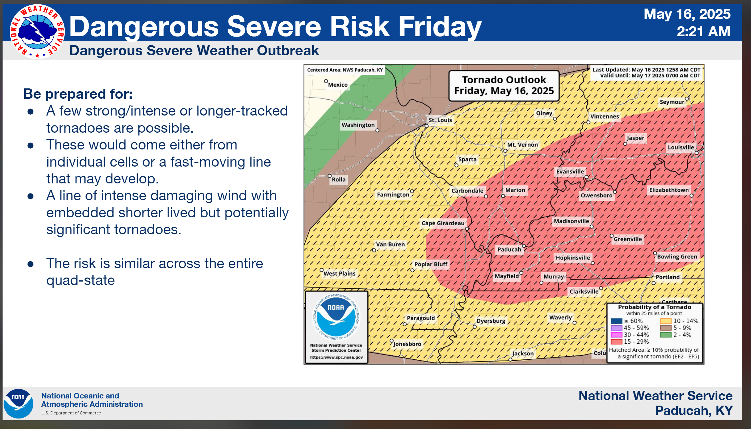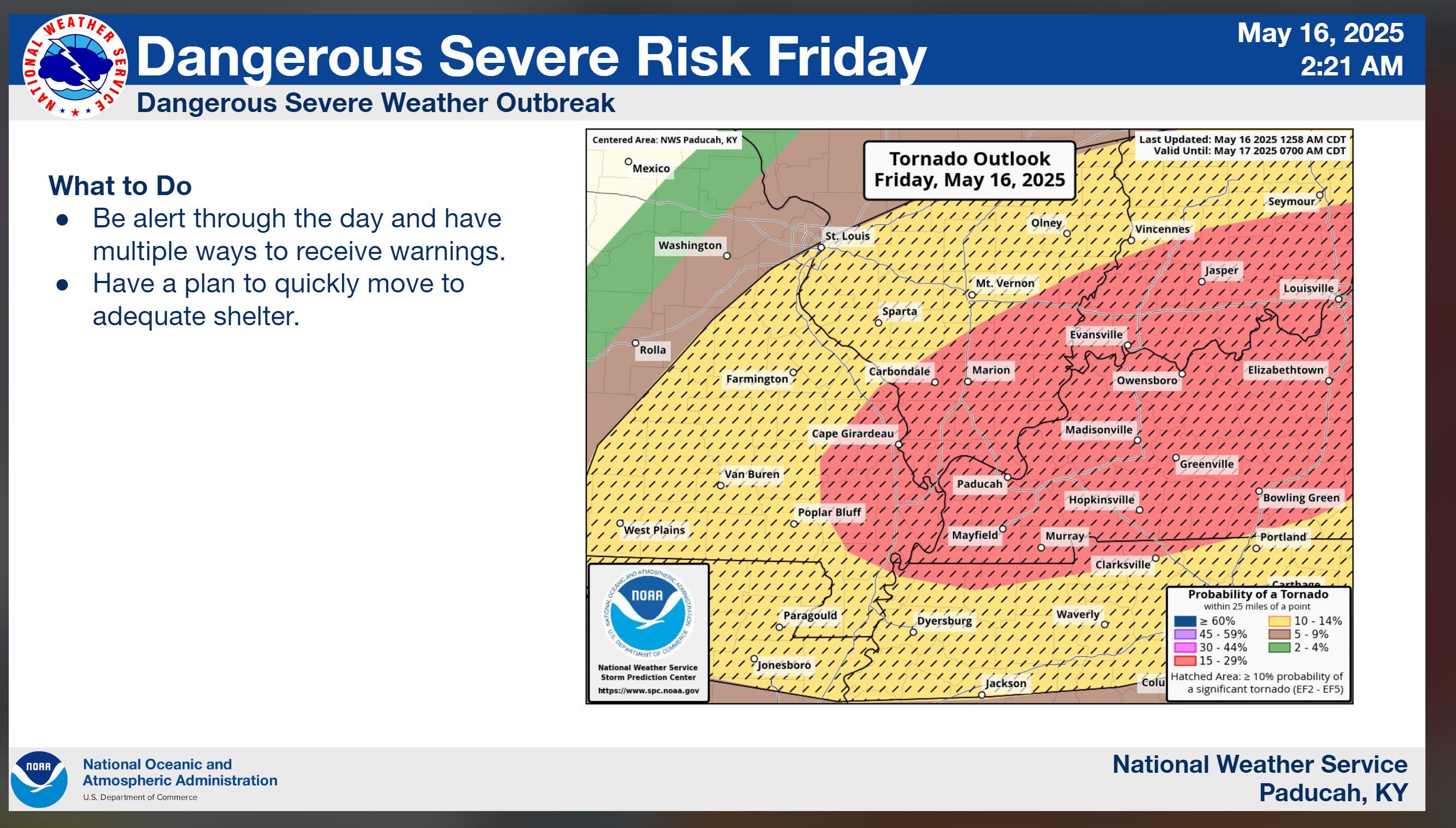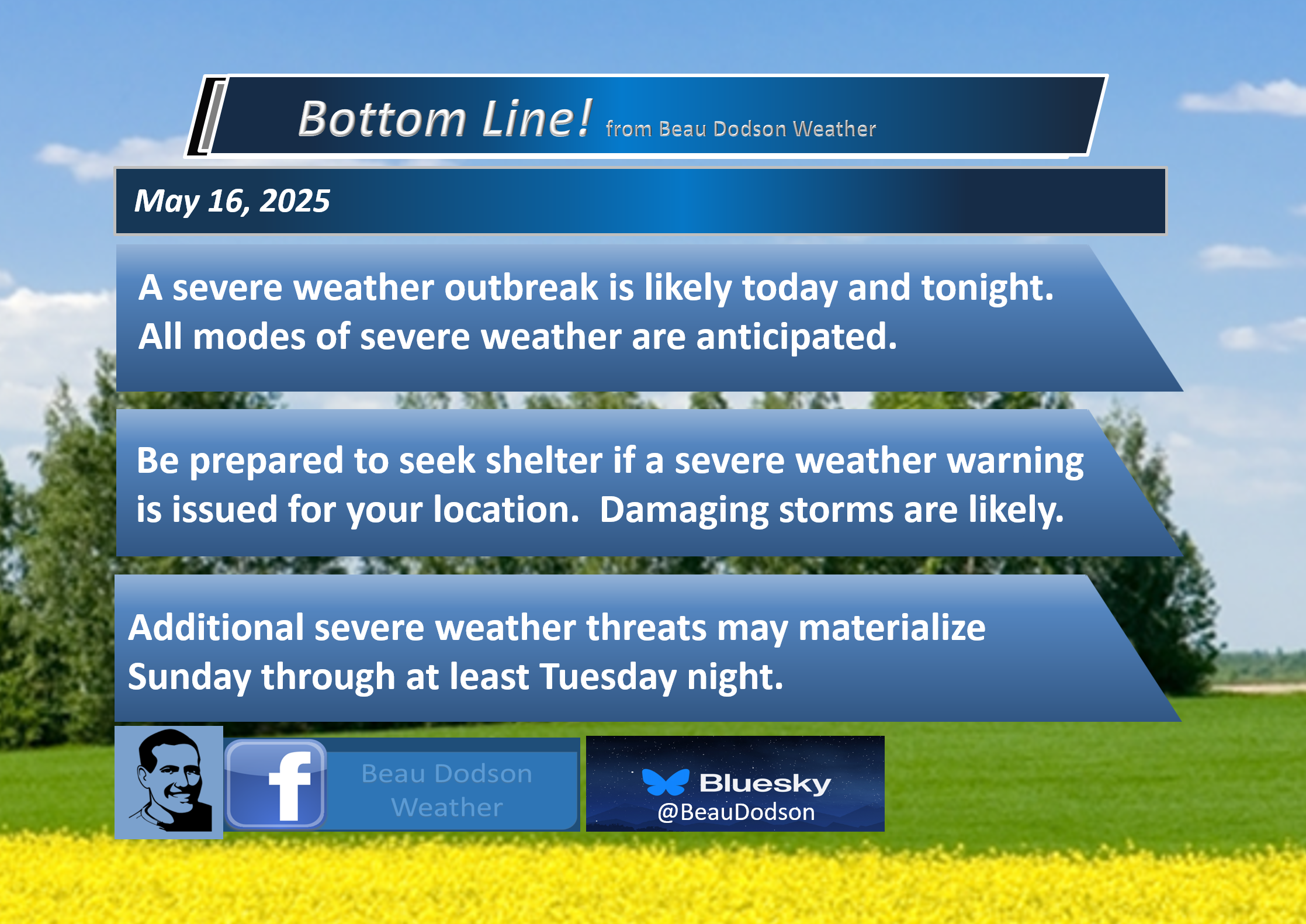 Severe thunderstorms are likely today and tonight. Some storms could produce baseball-size hail, 80+ mph wind gusts, and tornadoes.  A few strong, long-tracked tornadoes are possible.  Stay weather aware.  Numerous warnings are likely.