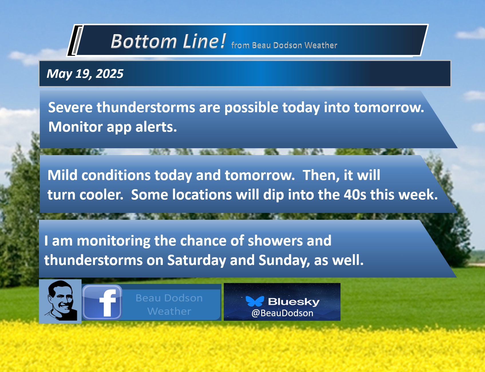 2. Are severe thunderstorms in the forecast? YES. Severe weather is possible today, tonight, and on Tuesday. I will monitor Saturday and Sunday.