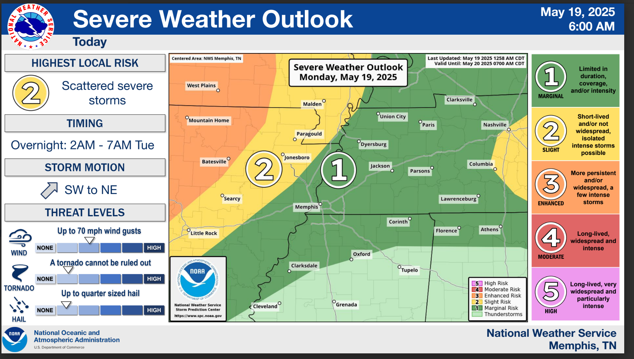 There is a risk of severe thunderstorms late this afternoon and tonight. The primary concern will be damaging wind gusts, quarter to half-dollar-sized hail, and a tornado.