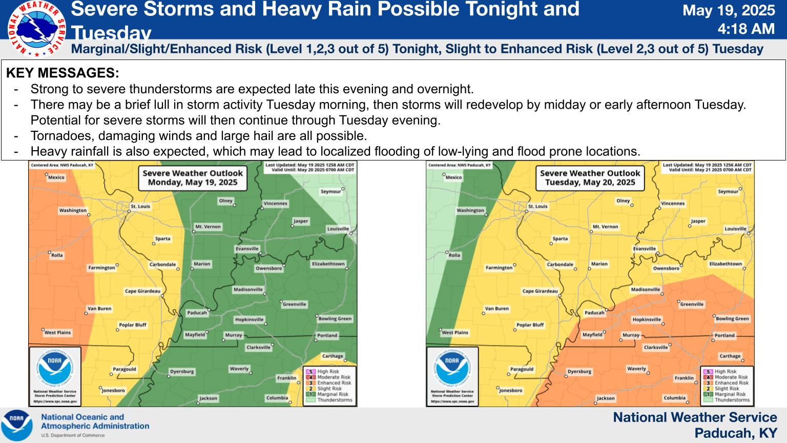 The risk will likely be higher on Tuesday afternoon across Kentucky and Tennessee. Monitor updates.