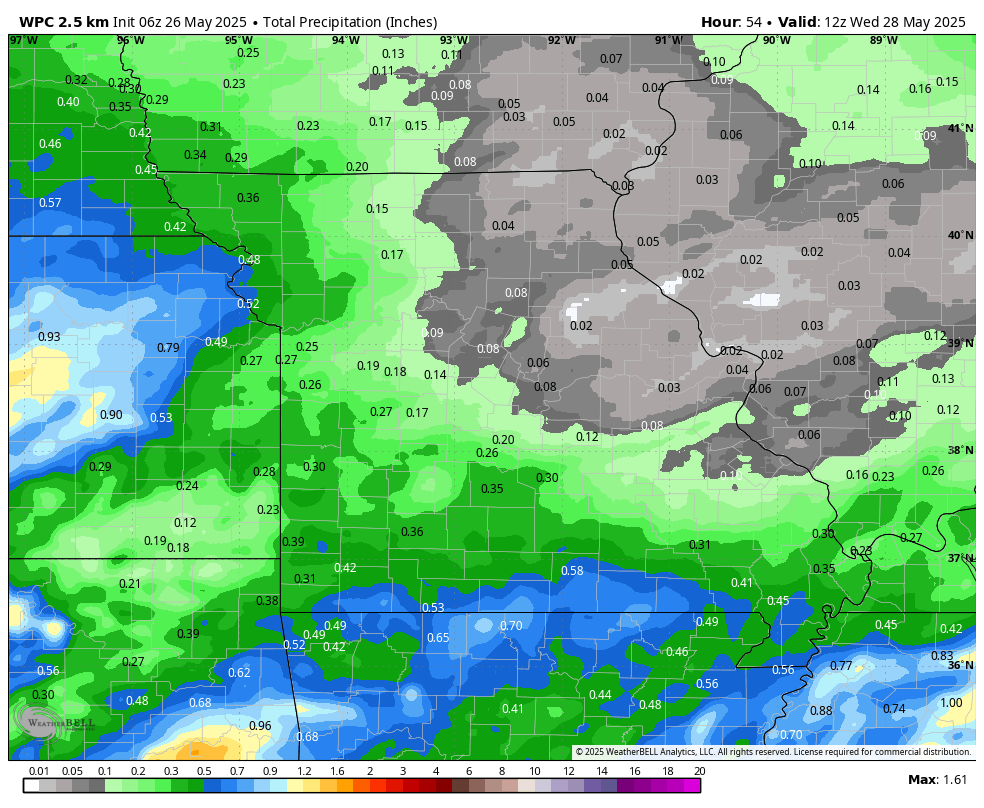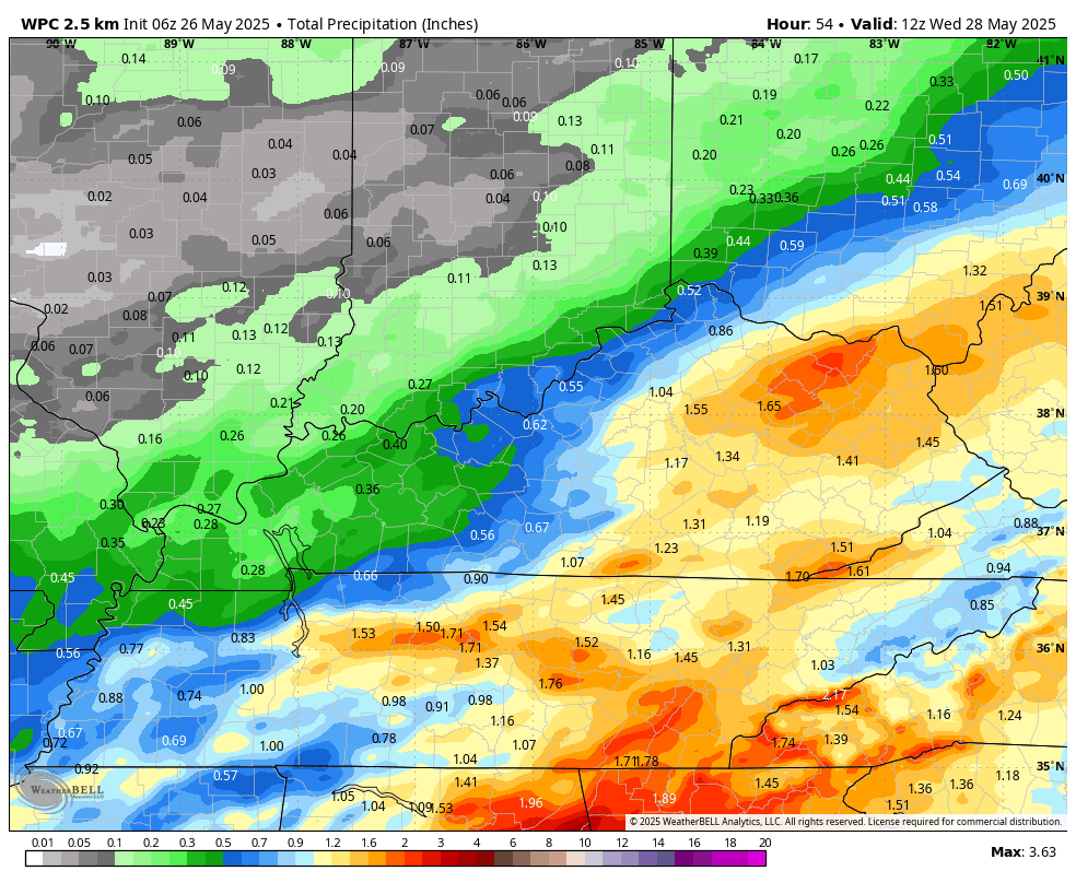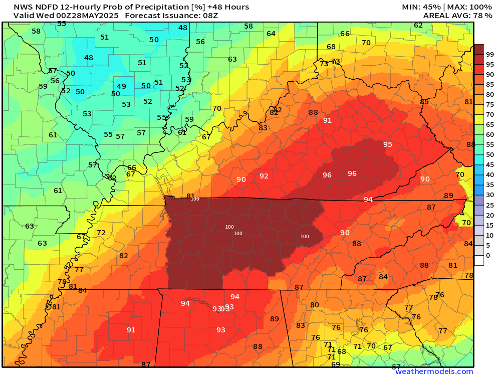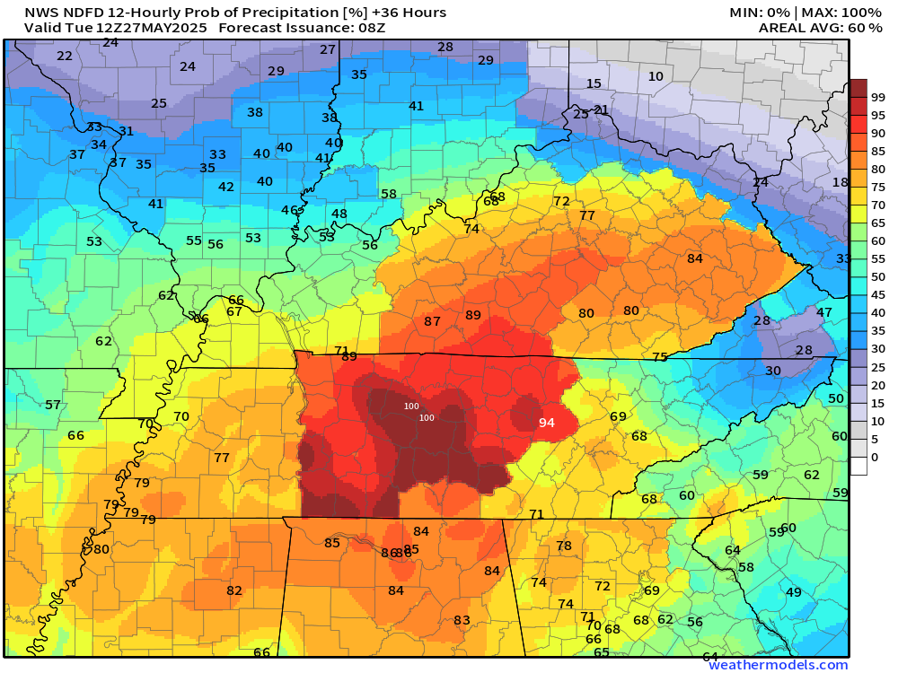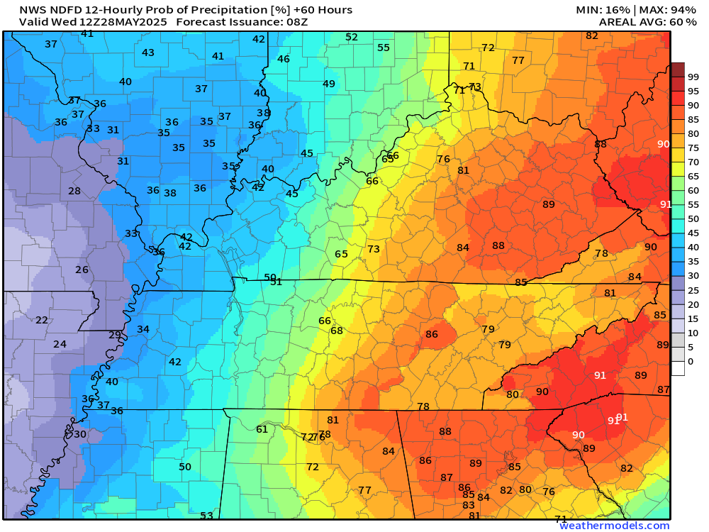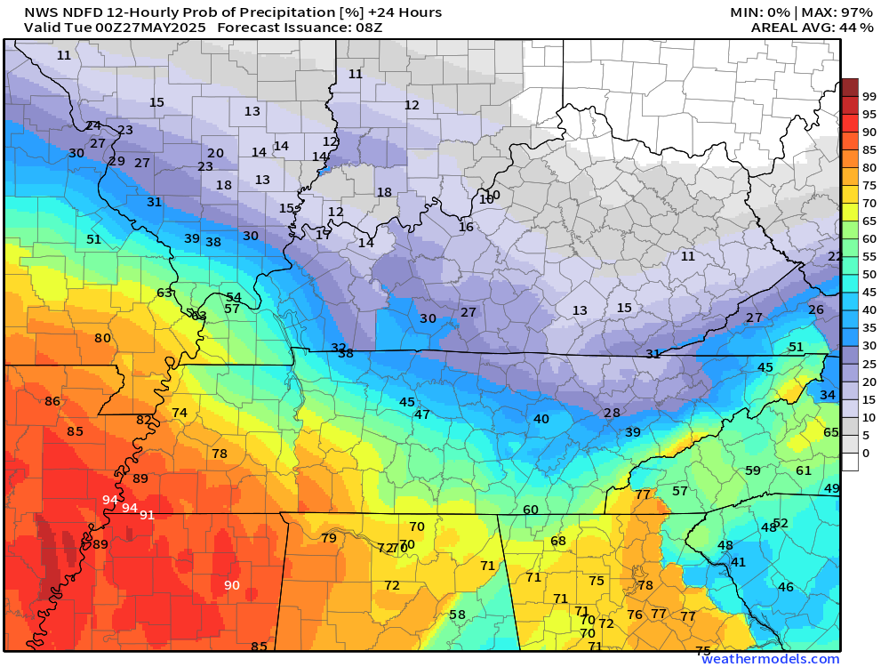 Let’s look at the rain probabilities.  This graphic might be a bit low across portions of Illinois/Kentucky.  We will have to see just how fast the rain moves into these areas.