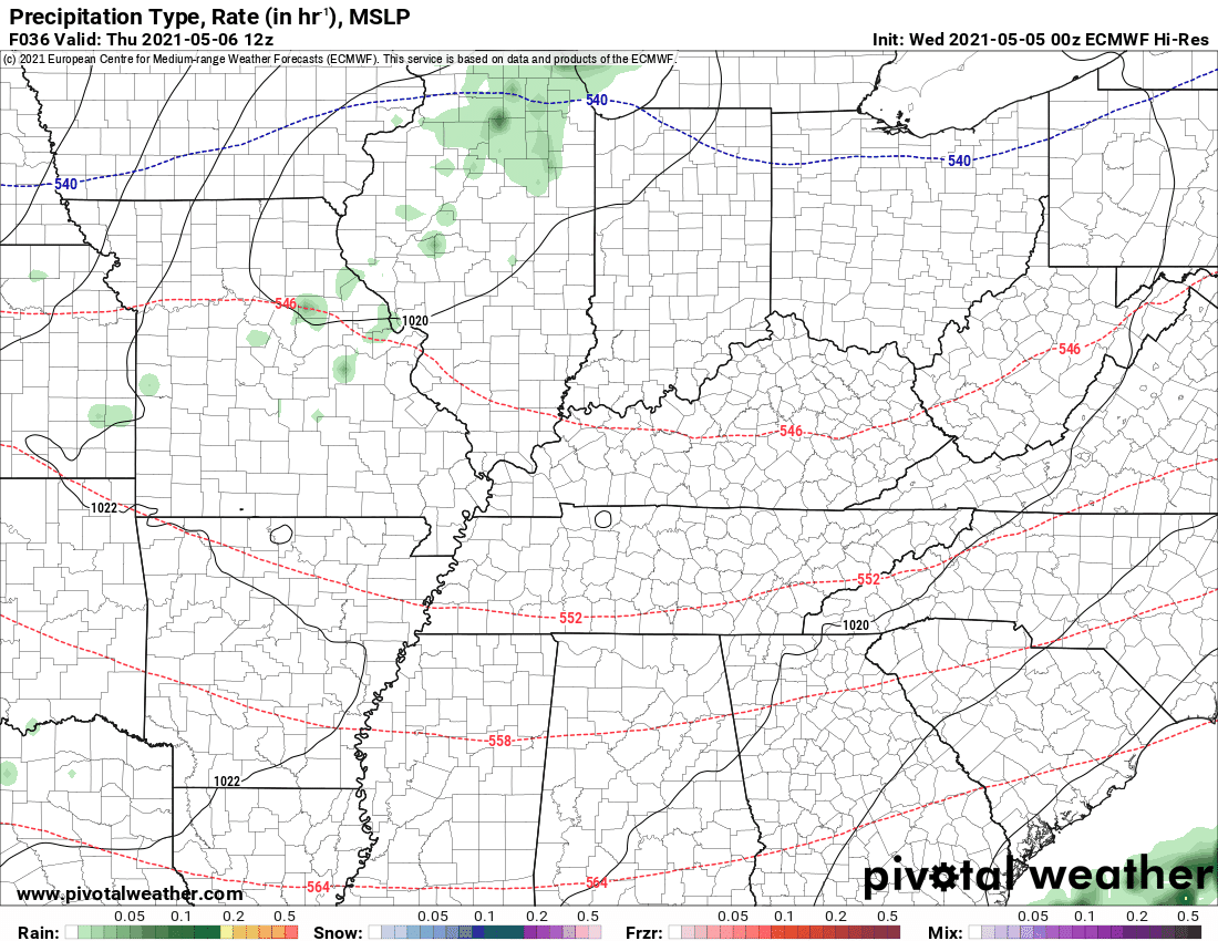 Temperature range: MO Bootheel 48° to 52° / SE MO 46° to 50° / South IL 48° to 52° / Northwest KY (near Indiana border) 48° to 52° / West KY 48° to 52° / NW TN 50° to 54°