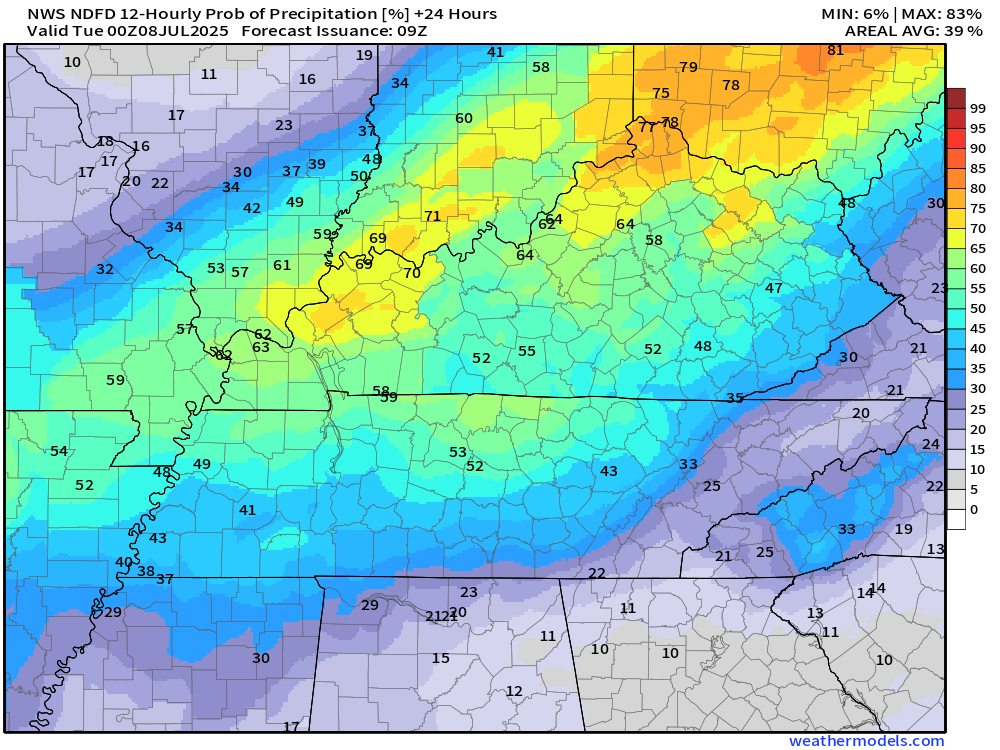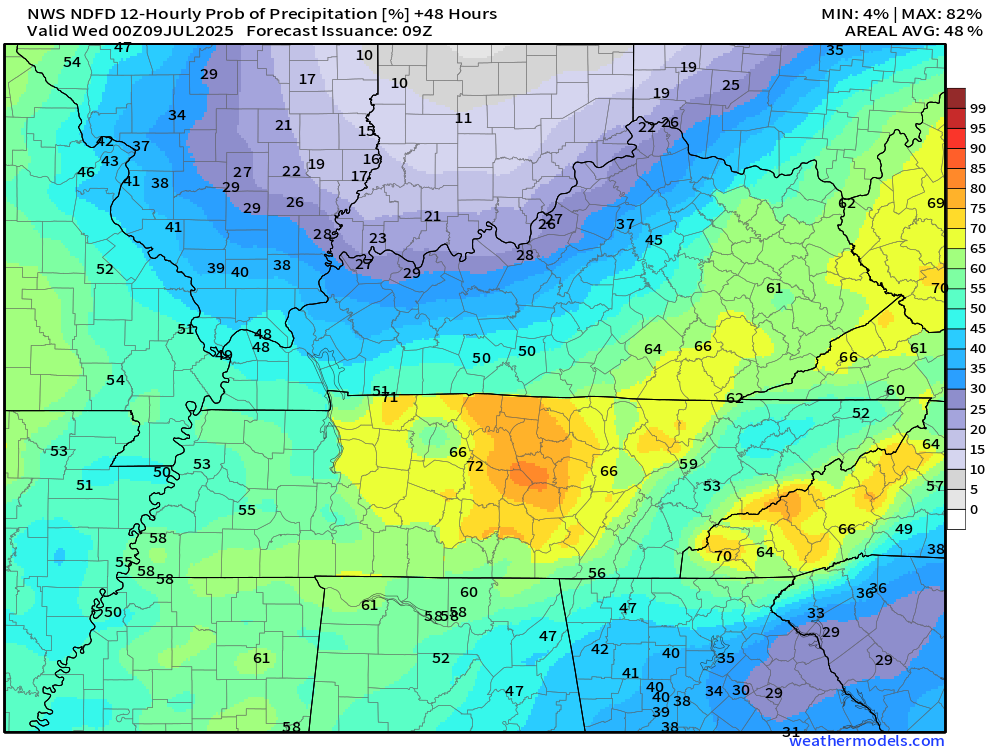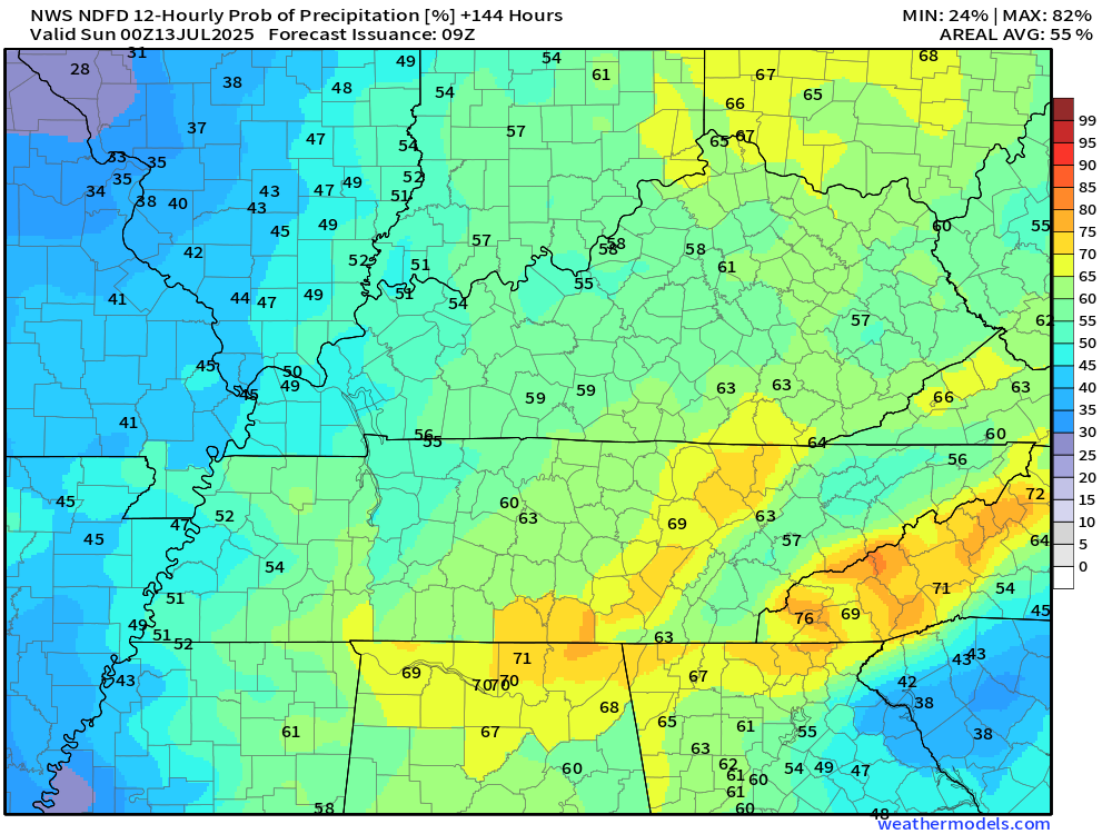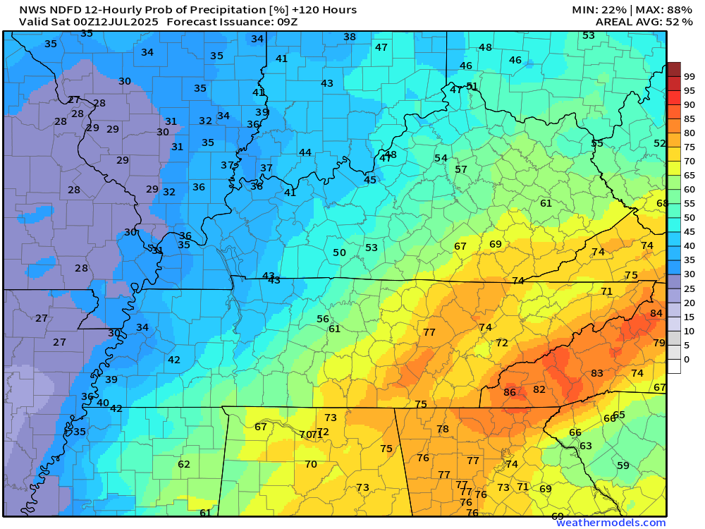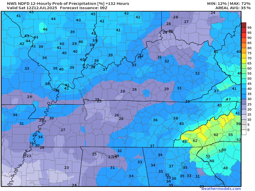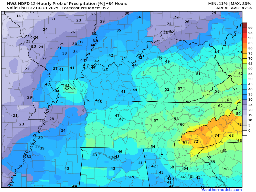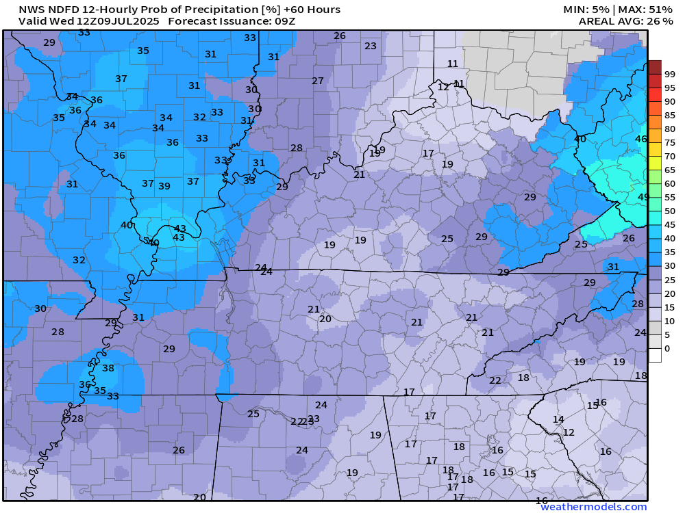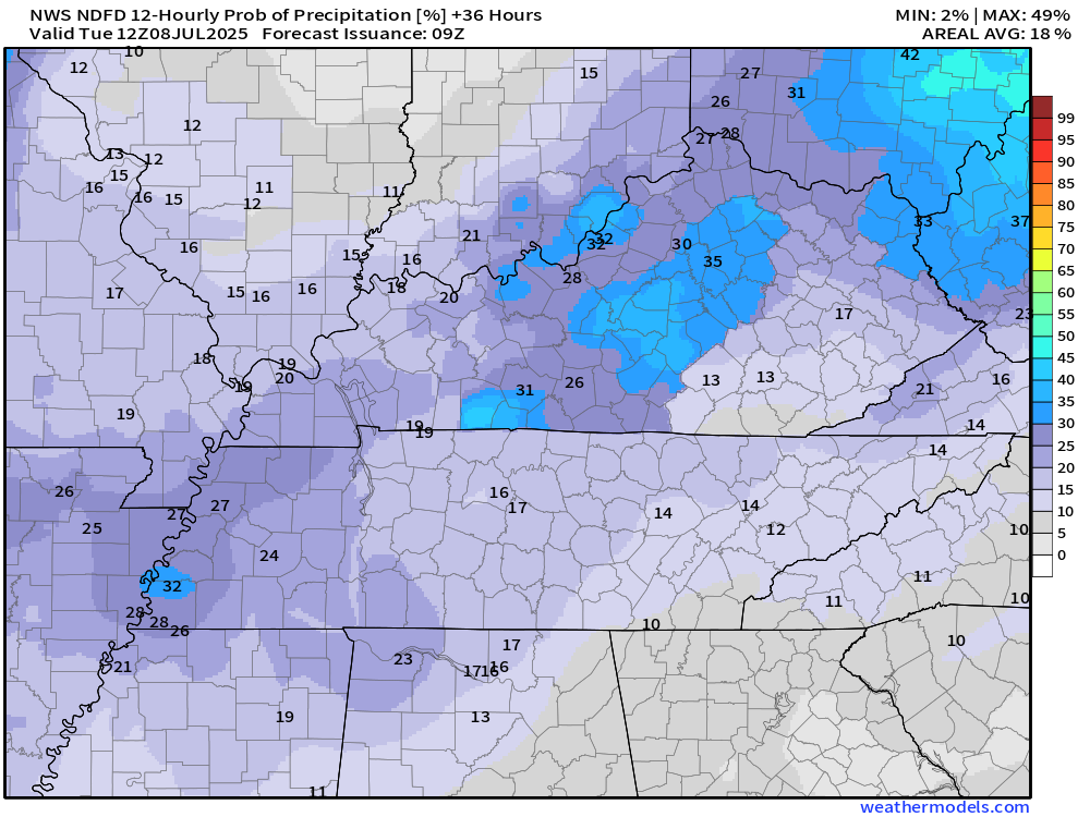 Let me show you the current rain probabilities.  Remember, a 20% chance of thunderstorms during the summer months usually means someone will have a gullywasher, but most areas will remain dry.  It does not mean that it won’t rain on your picnic.