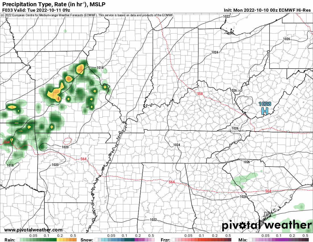 What is the chance of precipitation? MO Bootheel ~ 20% / the rest of SE MO ~ 30% / I-64 Corridor South IL ~ 40% / the rest of South IL ~ 20% / West KY ~ 5% / NW KY (near Indiana border) ~ 0% / NW TN ~ 0%