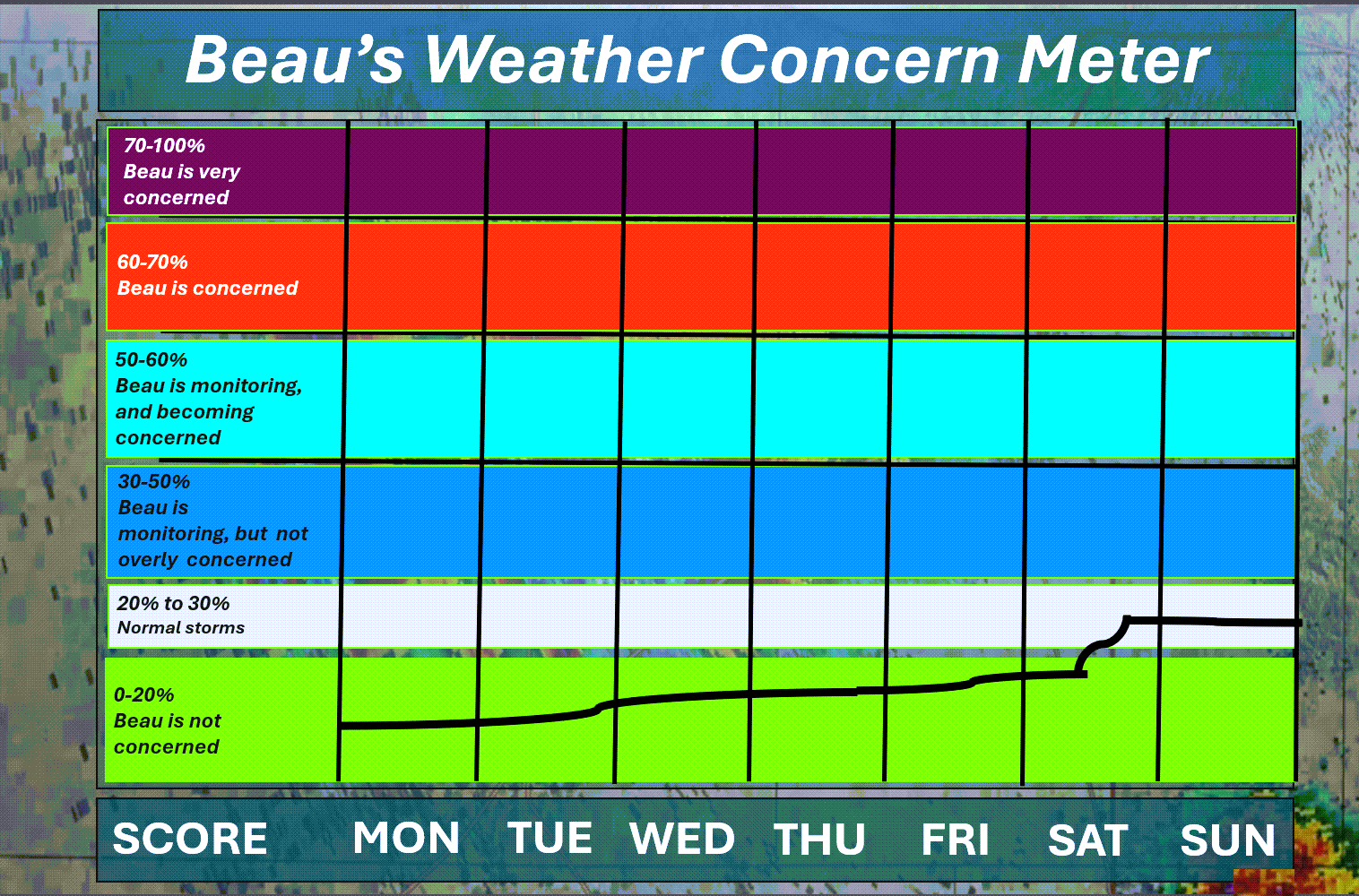 I will monitor the risk of thunderstorms on Saturday night and Sunday.