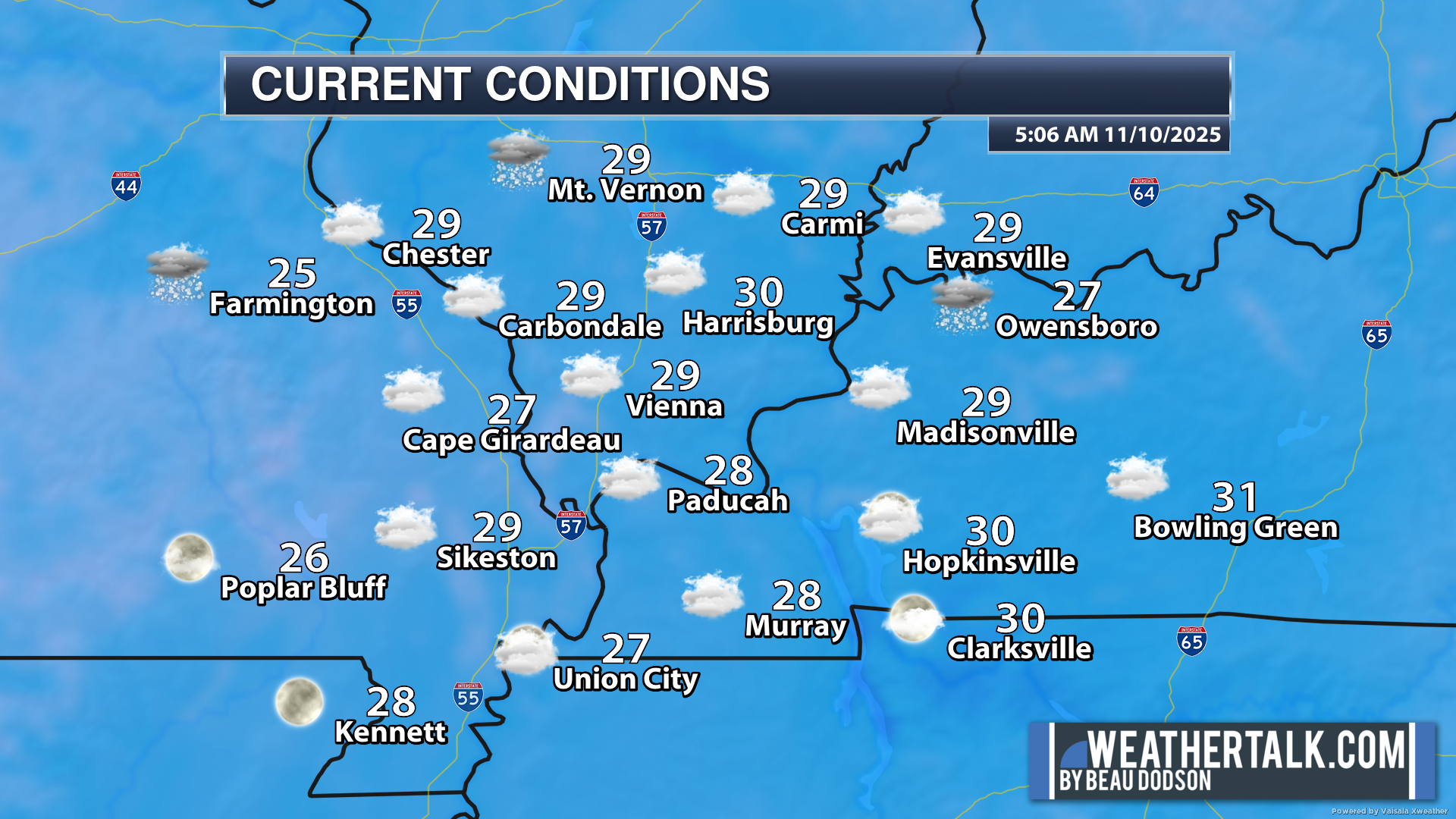 We are waking up to widespread 20s in the region.  Wind chill values have dipped into the teens.  We also have spotty flurries and snow showers over portions of southern Illinois and western Kentucky.