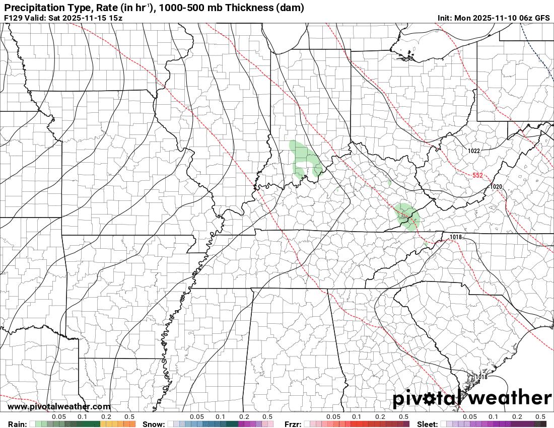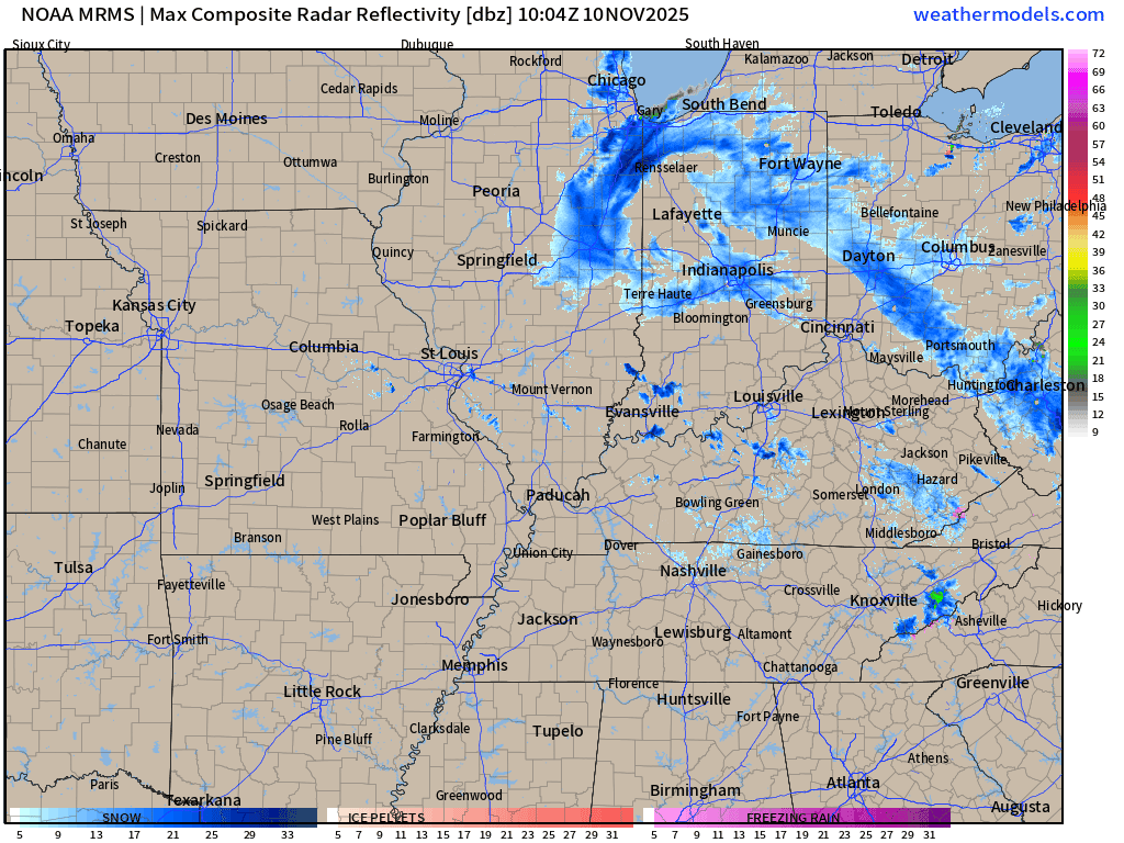8.  Is accumulating snow or ice in the forecast?  LOW RISK.  Snow showers today over mainly southeast Illinois and western Kentucky.  A small chance of a light dusting in spots.