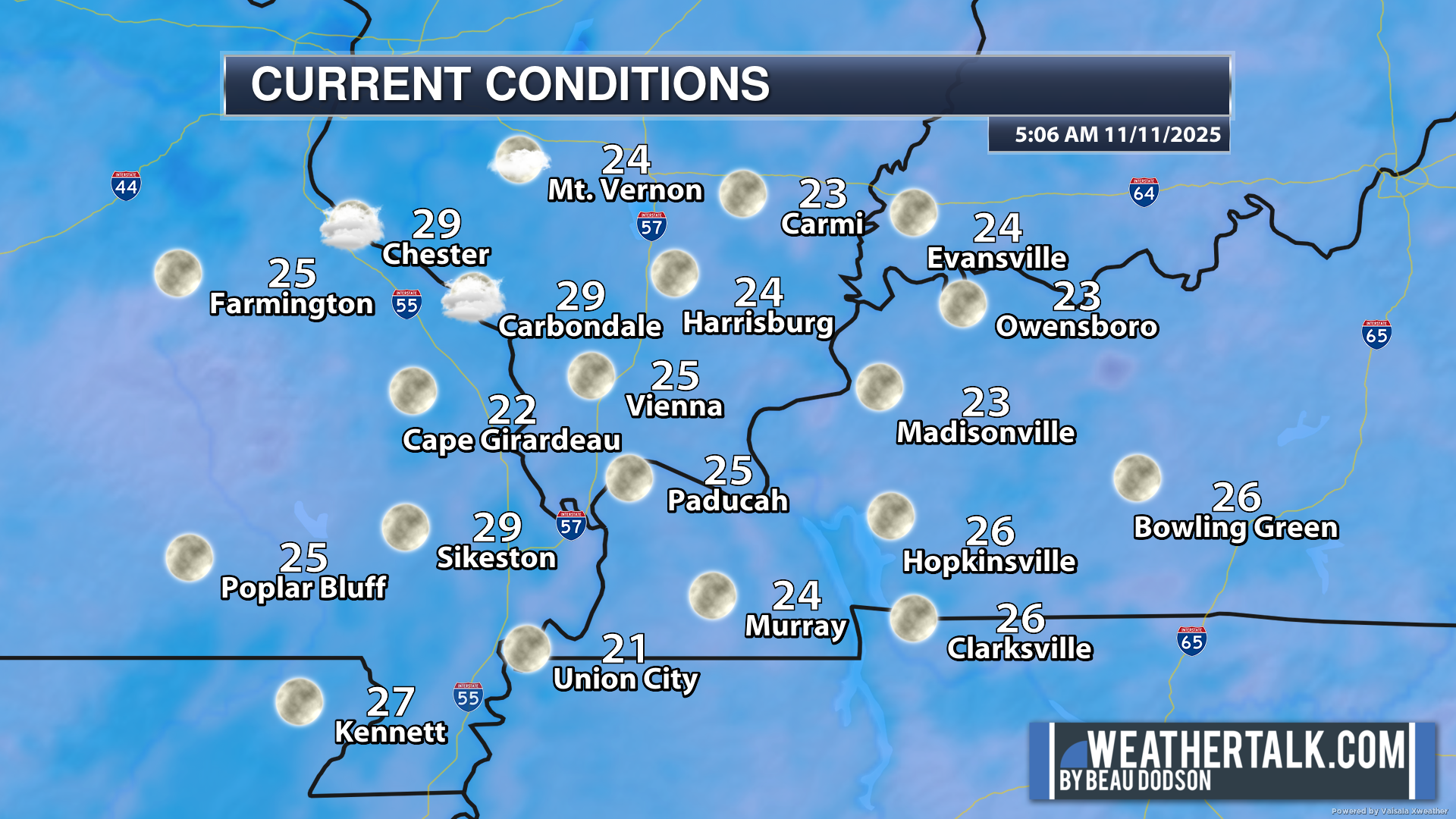 We are waking up to widespread 20s in the region. Wind chill values have dipped into the teens. We also have spotty flurries and snow showers over portions of southern Illinois and western Kentucky.