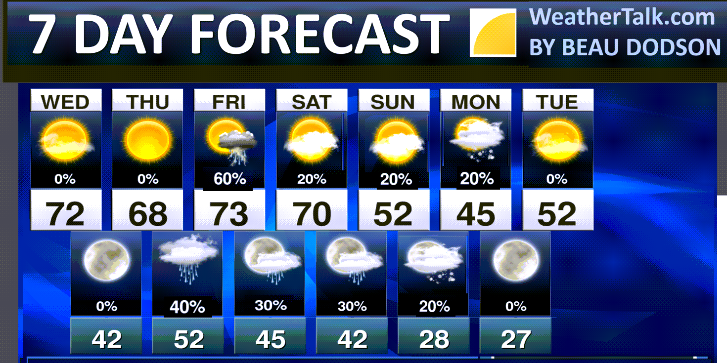 - A stronger cold front is expected on Saturday/Sunday. A few showers will also be possible with that front.