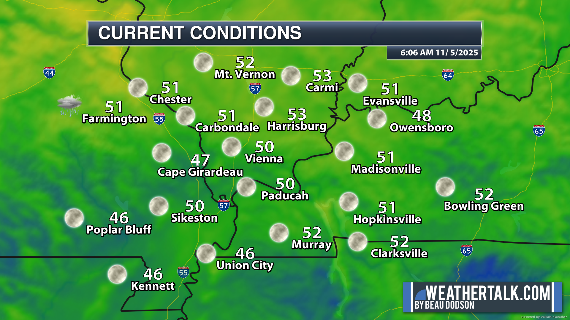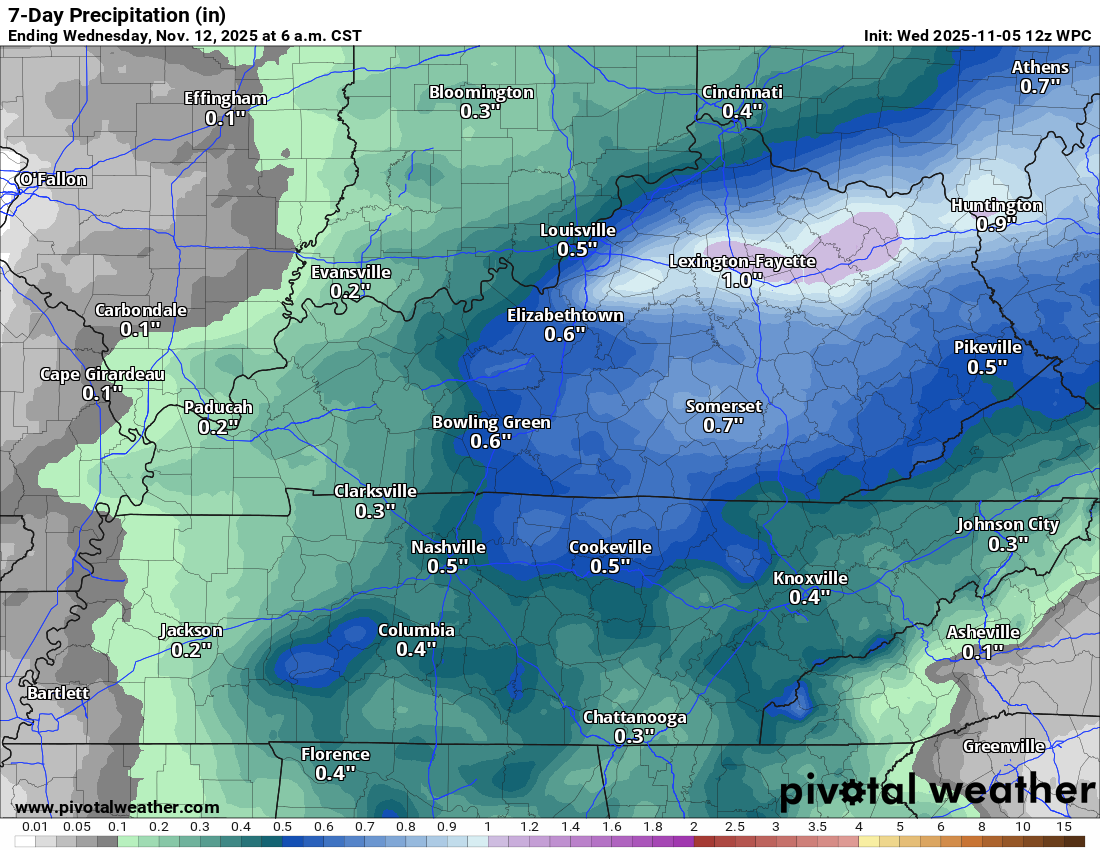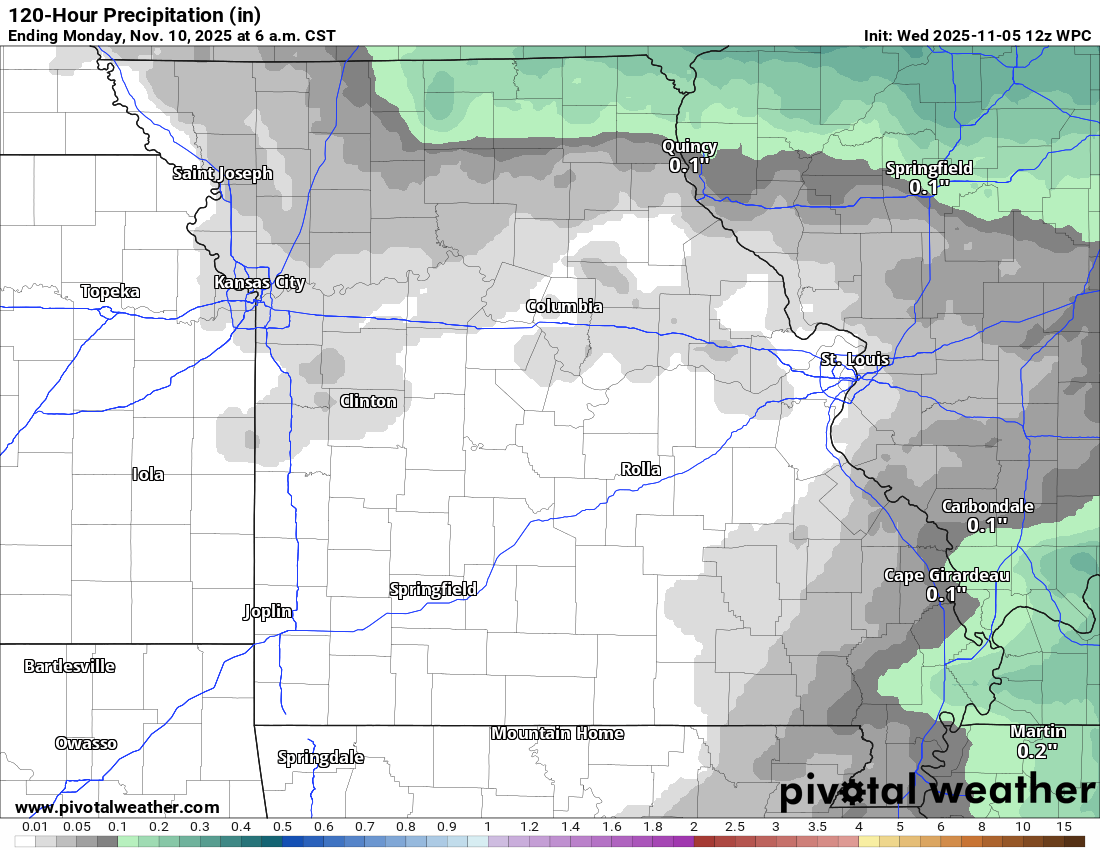 For the most part, however, rain totals will range from 0.01″ to 0.25″ over southeast Missouri and southern Illinois to 0.20″ to 0.50″ over western Kentucky and northwest Tennessee.