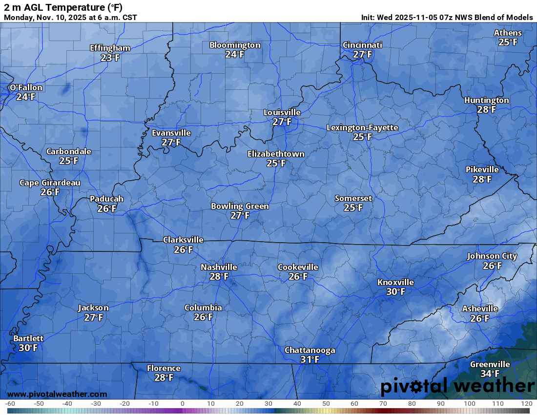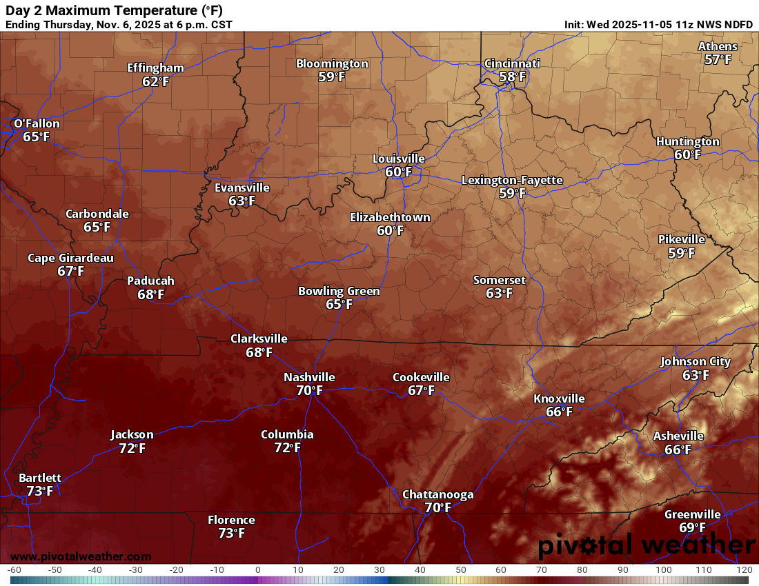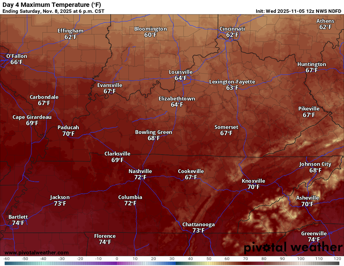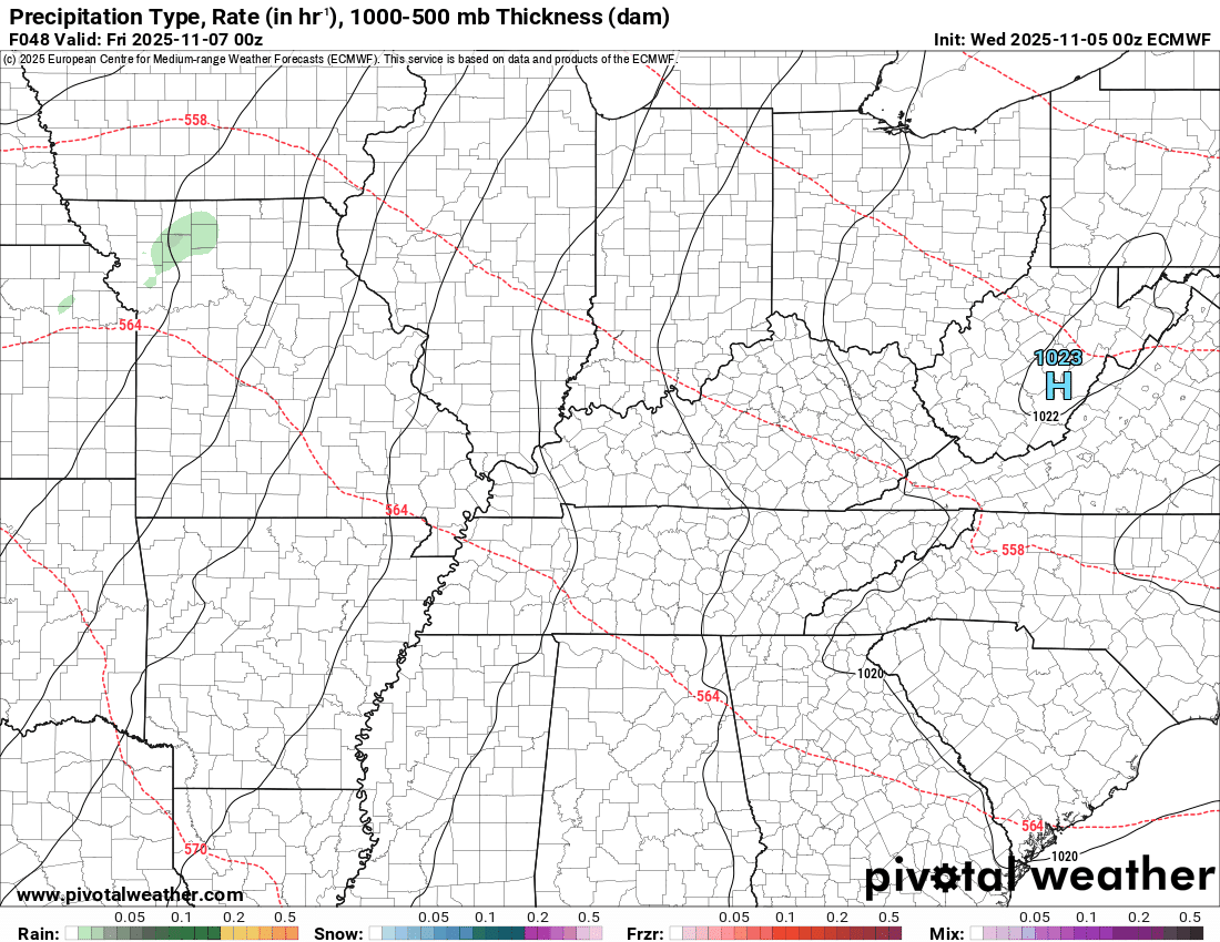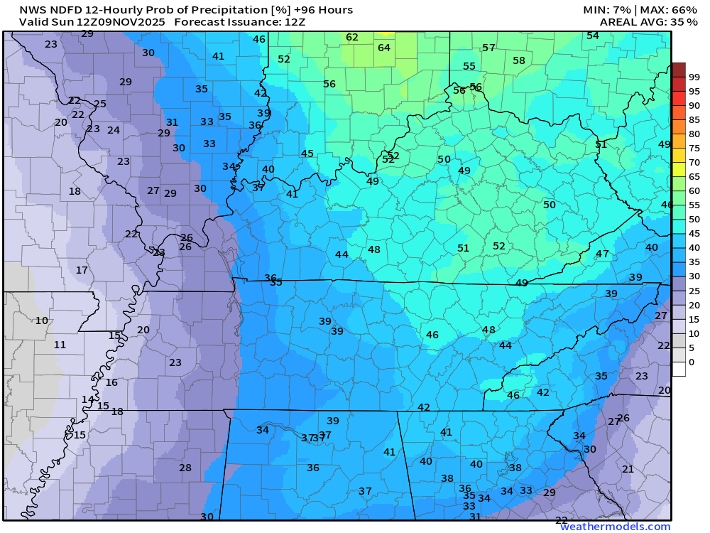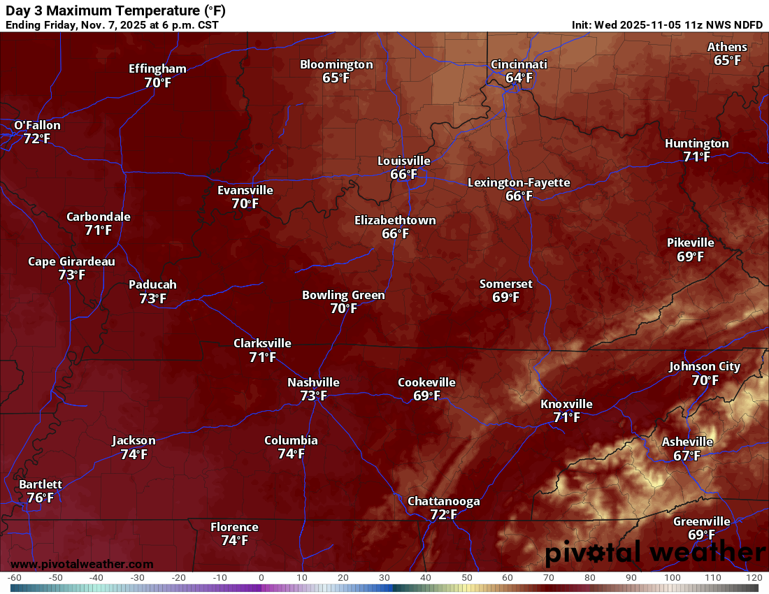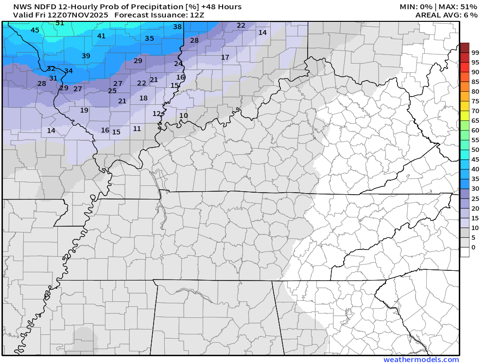 - Monitoring shower and thunderstorm chances late Thursday night into Friday evening. A few storms could be strong over Kentucky/Tennessee.