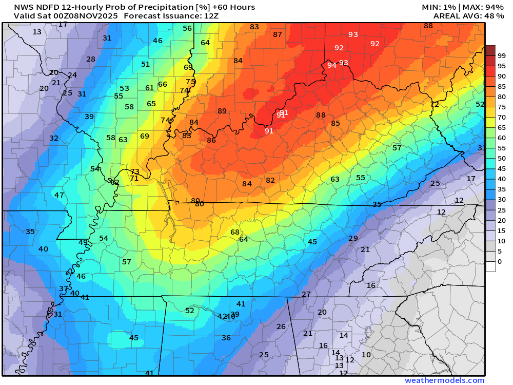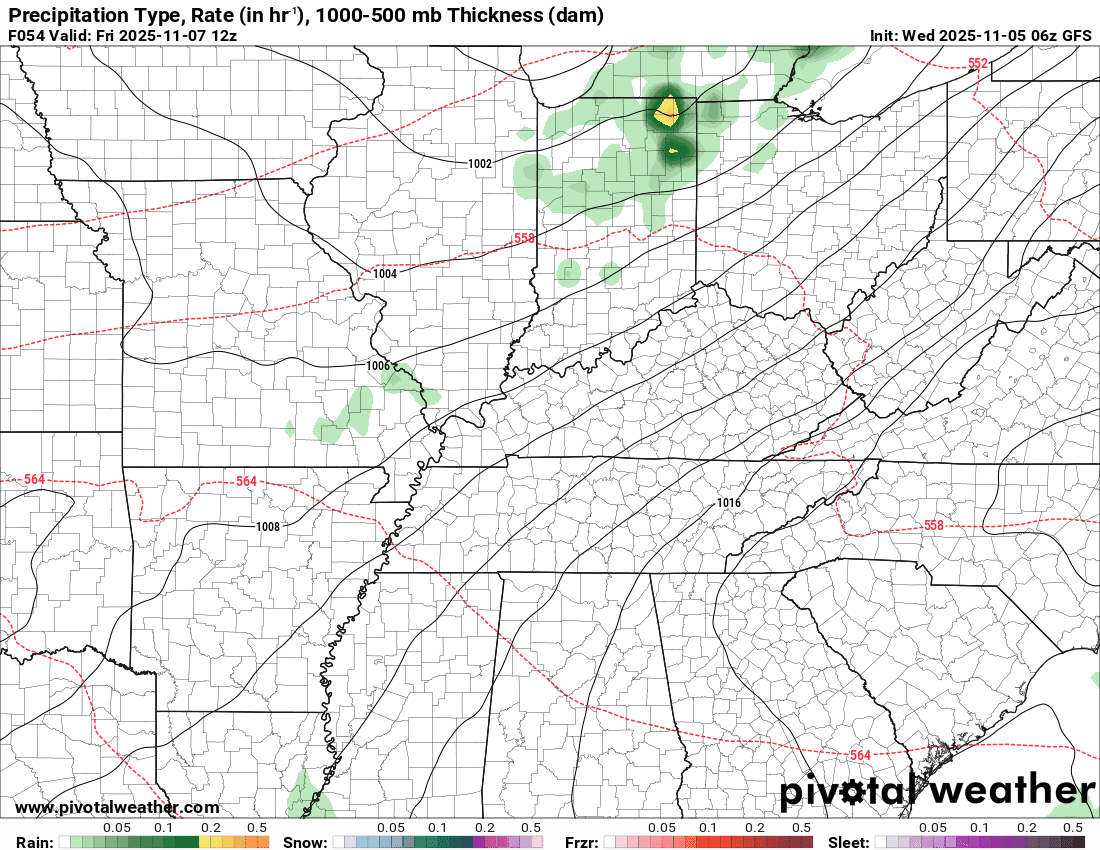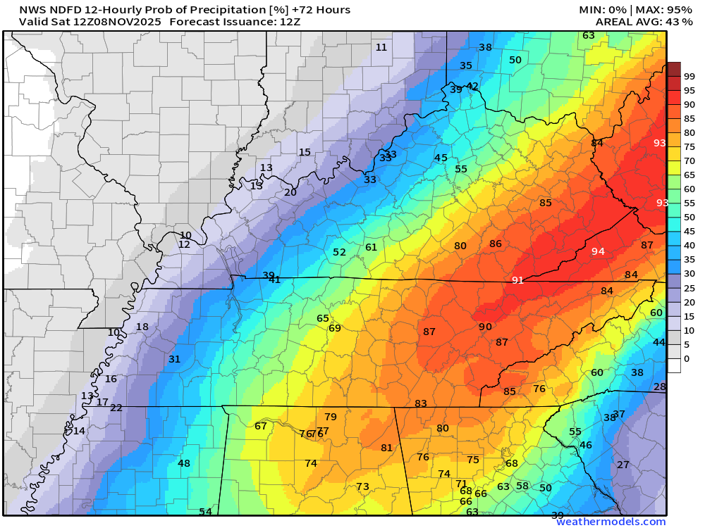 I kept us out of the blue, for now. Some data shows a few strong storms over Kentucky/Tennessee on Friday afternoon/evening. I am monitoring trends in the guidance.