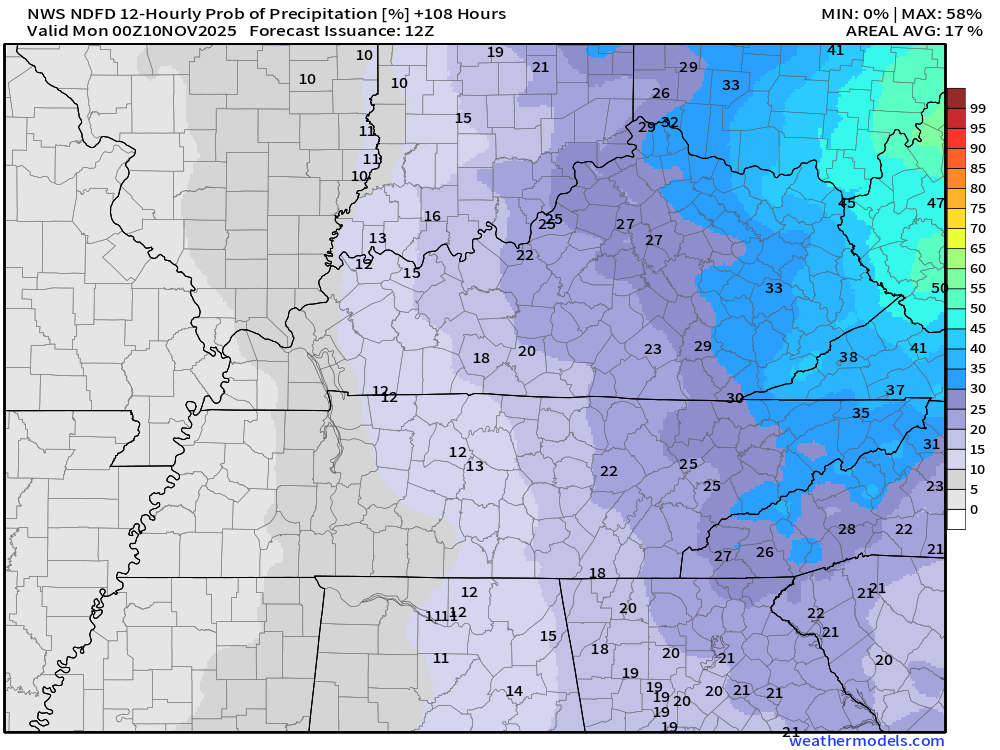 Whether there will be enough moisture left for flurries is questionable. The chance will be a bit higher over Kentucky.