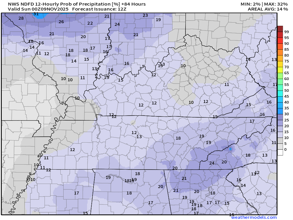 Some of the model guidance indicates that the Saturday front will move through our region dry. I do believe we will see at least a few showers develop along the front. Chances will be a bit higher over Kentucky and Tennessee. A bit lower over Missouri and Illinois.