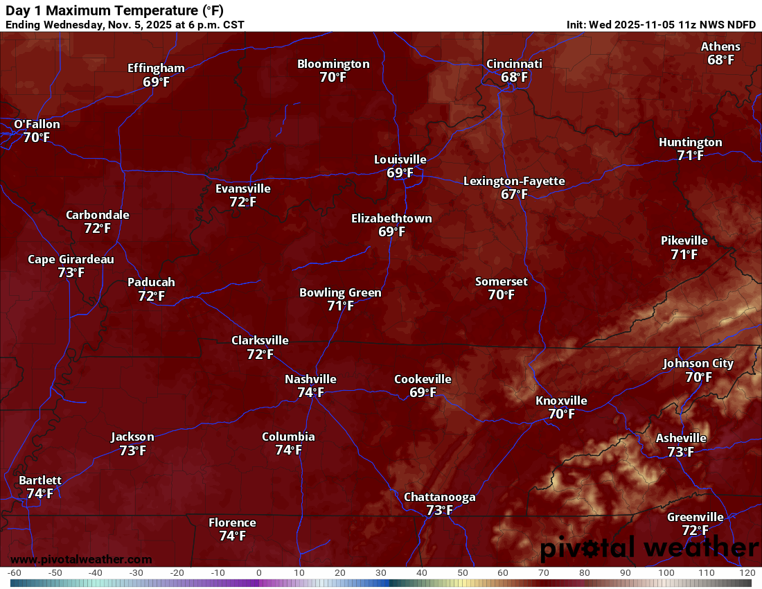 Thunderstorms will be possible with the front. A few of the storms could be strong with gusty wind and small hail. The risk of severe weather appears limited, but perhaps not zero. The risk for stronger storms will be higher over Kentucky/Tennessee. Monitor updates.