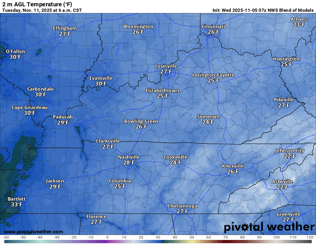 You can see the cold air arriving in this animation. Those blue colors are temperatures in the 20s.